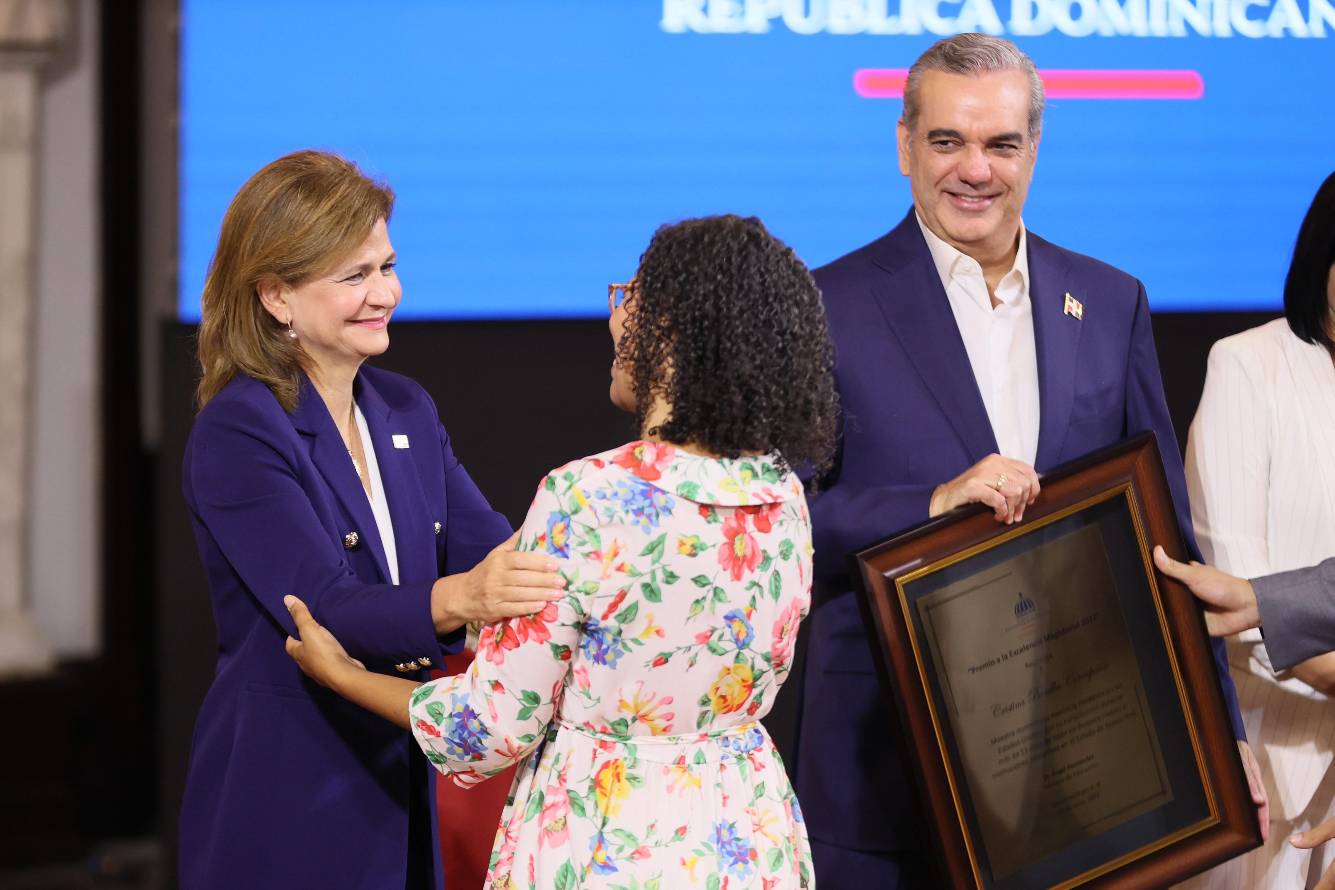 El presidente Luis Abinader, en compañía de la vicepresidenta Raquel Peña y la primera dama Raquel Arbaje, hizo entrega del «Premio a la Excelencia Magisterial 2024», en cuyo acto se destacó la trayectoria, el compromiso, los aportes y los logros académicos de estos docentes. Santo Domingo, República Dominicana, 2 de Julio 2024. Vp/ Felix Hirujo