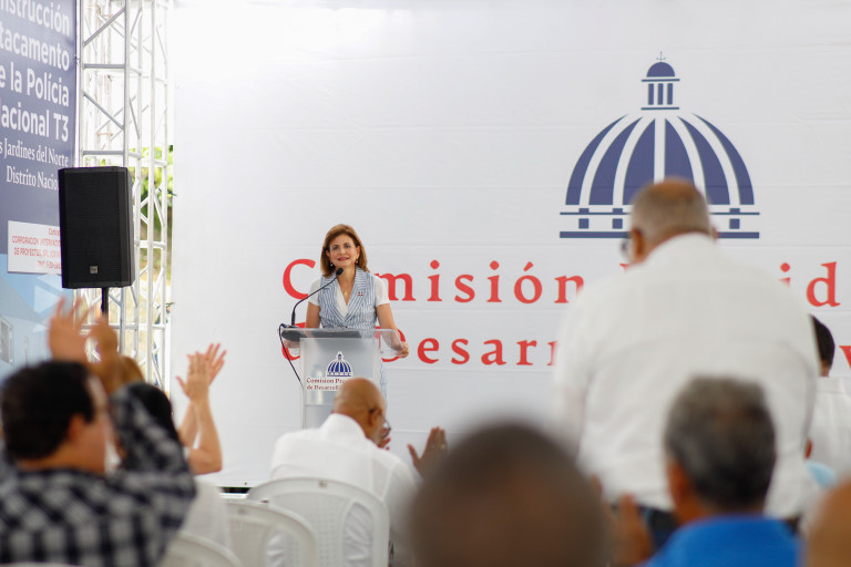 La vicepresidenta Raquel Peña dejó iniciados los trabajos de construcción del Destacamento T3, de la Policía Nacional T3, en los Jardines del Norte, en el Distrito Nacional. Este espacio optimizará el alcance de los servicios de seguridad en esta comunidad y, además, permitirá la capacitación y entrenamiento de los agentes del orden. Santo Domingo, República Dominicana, 14 de Julio 2024. Vp/ Amehd Gitte