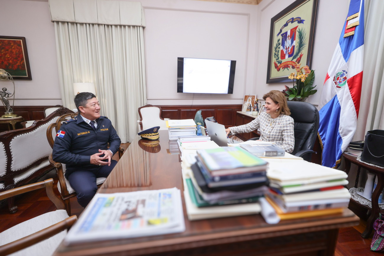 La vicepresidenta Raquel Peña recibió la visita de cortesía del general Minoru Matsunaga, P. N., director de la Dirección Central de Policía de Turismo. En este encuentro, dialogaron sobre temas de interés común. Santo Domingo, República Dominicana. 16 de Julio del 2024. VP/ Félix Hirujo