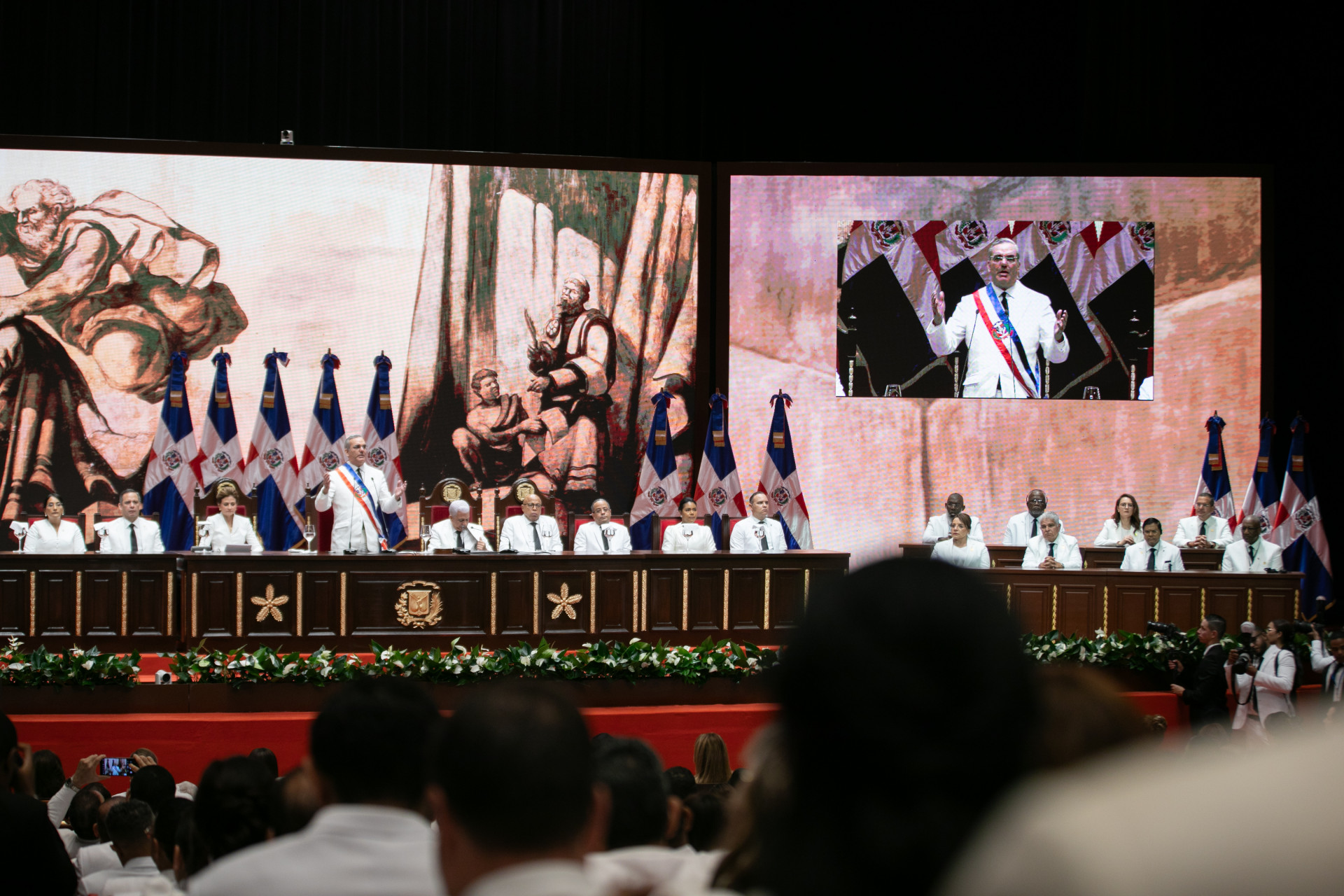 El presidente Luis Abinader y la vicepresidenta Raquel Peña fueron juramentados para el período constitucional 2024-2028. El mandatario expresó, durante su discurso ante la Asamblea Nacional, que no defraudará la confianza del pueblo dominicano, y trabajará incansablemente para que sigamos cosechando más desarrollo y transformando la República Dominicana. Santo Domingo, República Dominicana, 16 de Agosto 2024. Vp/ Felix Hirujo