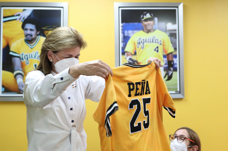 La señora Vicepresidenta Raquel Peña participa realizando el lanzamiento de la primera bola en el juego de Beisbol entre Aguilas y Gigantes en Santiago Republica Dominicana. 15 de Noviembre 2020 VP/Ricardo Rojas