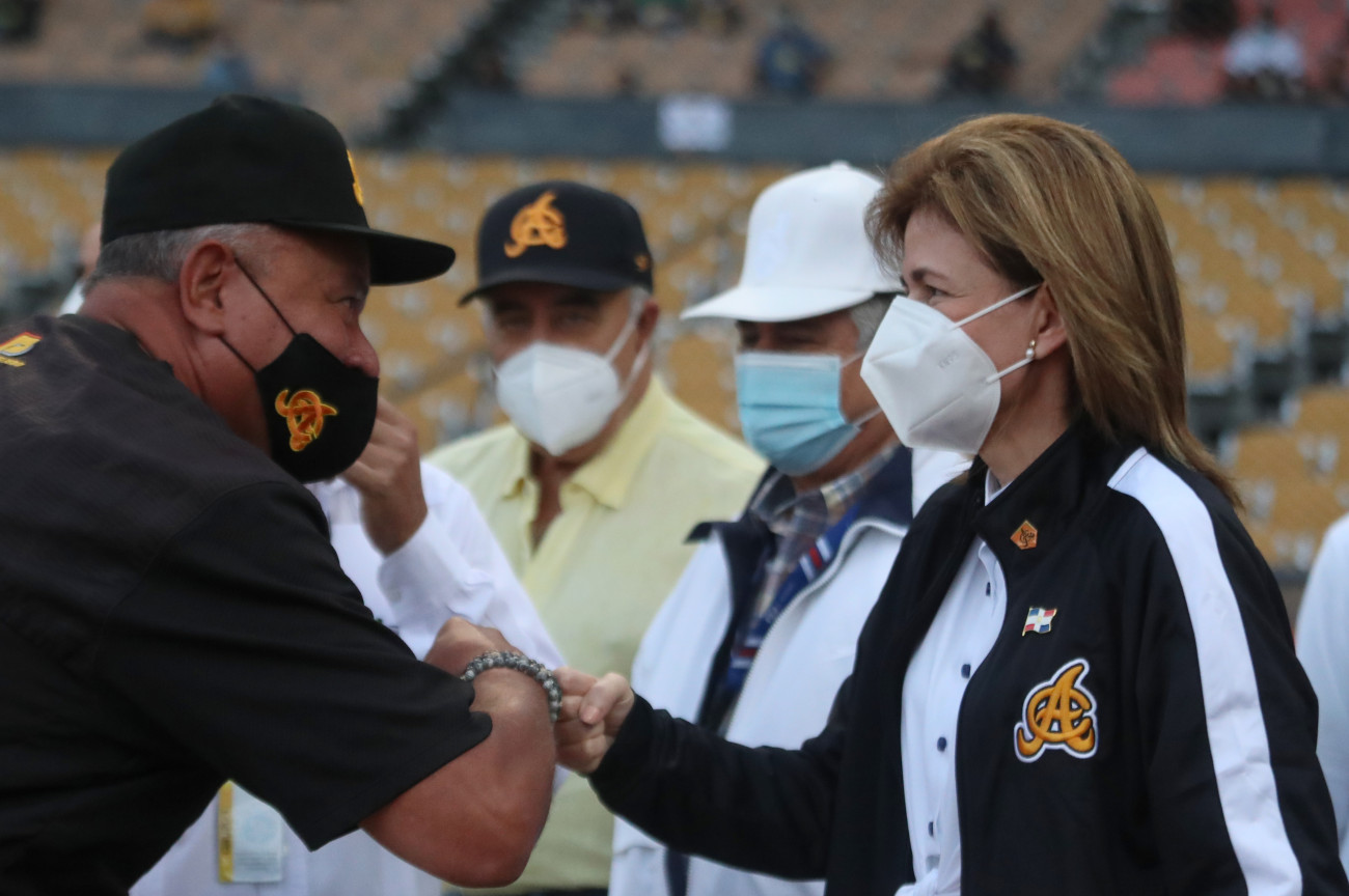 La señora Vicepresidenta Raquel Peña participa realizando el lanzamiento de la primera bola en el juego de Beisbol entre Aguilas y Gigantes en Santiago Republica Dominicana. 15 de Noviembre 2020 VP/Ricardo Rojas