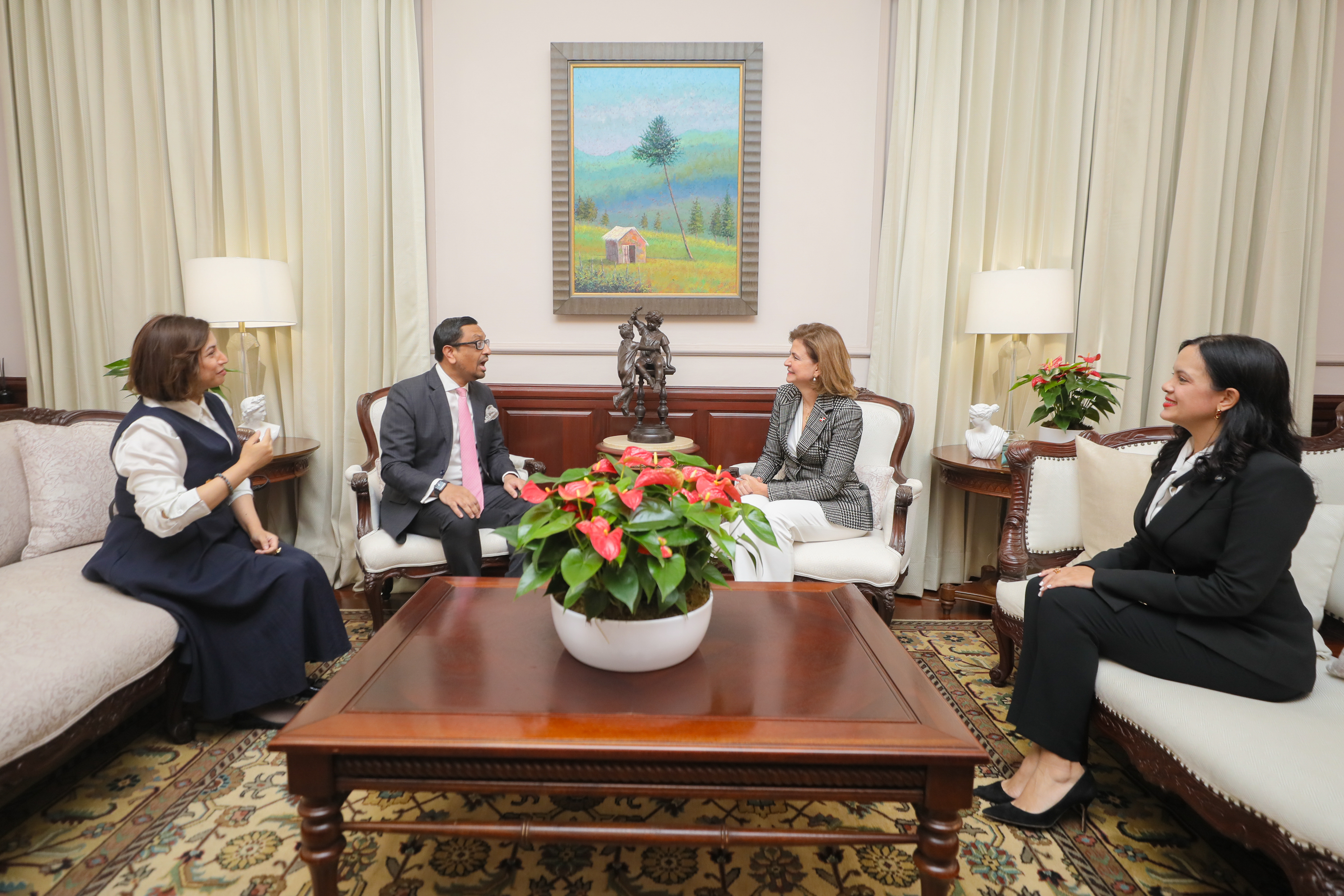 La vicepresidenta Raquel Peña recibió al embajador de Su Majestad británica en el país, S. E. Mockbul Ali, quien se despide del país, tras concluir su labor al frente de la misión diplomática de esa nación europea. En su reunión, dialogaron sobre su gestión y el futuro de las relaciones bilaterales entre República Dominicana y el Reino Unido. Santo Domingo, República Dominicana.04 de Octubre del 2024. VP/ Félix Hirujo
