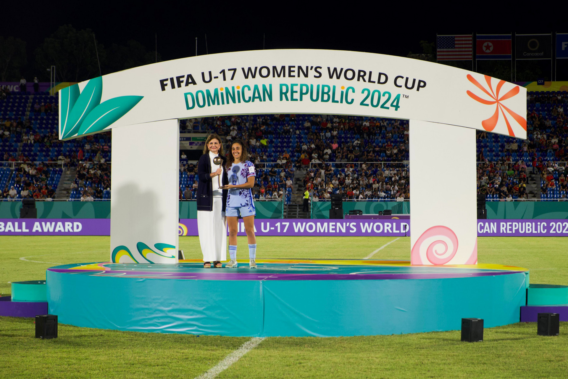 La vicepresidenta Raquel Peña estuvo presente durante la clausura de la Copa Mundial de Fútbol Femenino Sub-17, en la que el talento y la pasión de equipos de todo el mundo se hicieron evidentes en este importante torneo que se celebró por primera vez en el país. Durante el evento, la mandataria participó en la entrega de premios, momento en el que se reconoció a todos los ganadores, incluido al equipo campeón: Corea del Norte. Santiago, República Dominicana. 3 de Noviembre del 2024.