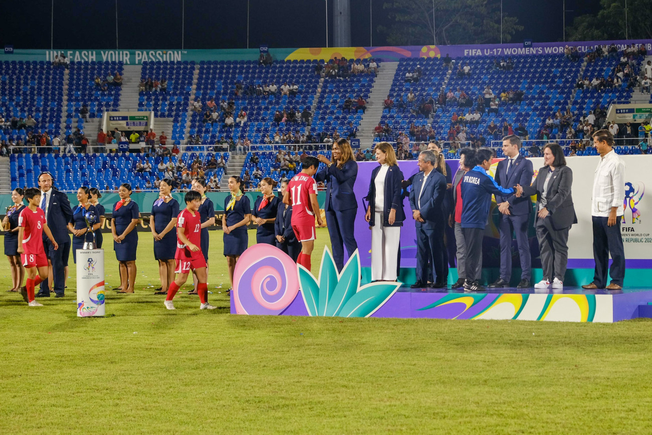 La vicepresidenta Raquel Peña estuvo presente durante la clausura de la Copa Mundial de Fútbol Femenino Sub-17, en la que el talento y la pasión de equipos de todo el mundo se hicieron evidentes en este importante torneo que se celebró por primera vez en el país. Durante el evento, la mandataria participó en la entrega de premios, momento en el que se reconoció a todos los ganadores, incluido al equipo campeón: Corea del Norte. Santiago, República Dominicana. 3 de Noviembre del 2024.