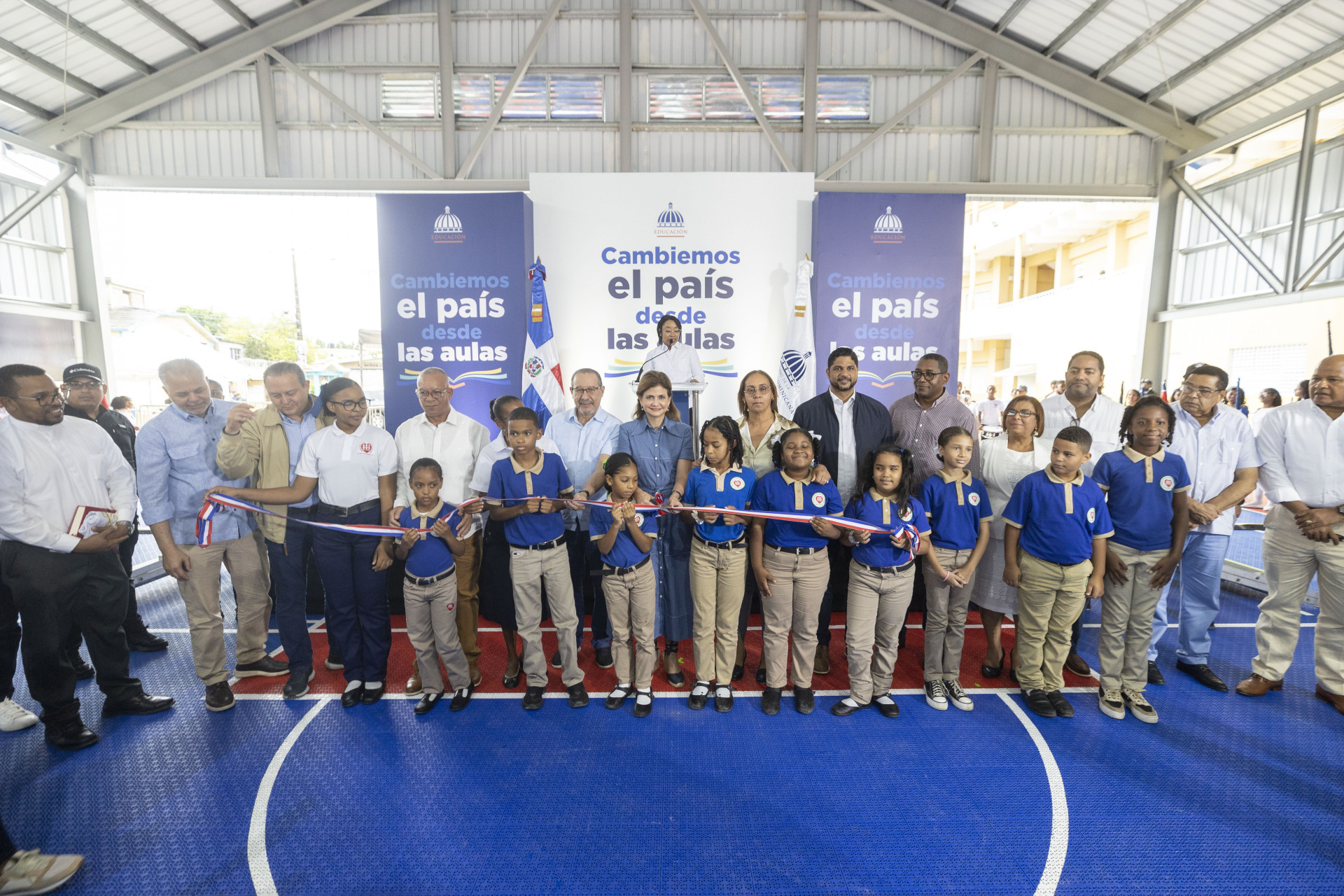 La vicepresidenta Raquel Peña participó en la inauguración del techado de la cancha del Centro Educativo Marcos Castañer Fe y Alegría, en Madre Vieja Norte, donde también fue anunciada la inauguración del techado de la cancha de la Escuela Ana Lilian Miranda. Con estas obras, sus estudiantes podrán ejercer diversas prácticas deportivas en un espacio digno para todos y todas. Santo Domingo, República Dominicana, 10 de Noviembre 2024. Vp/Felix Hirujo