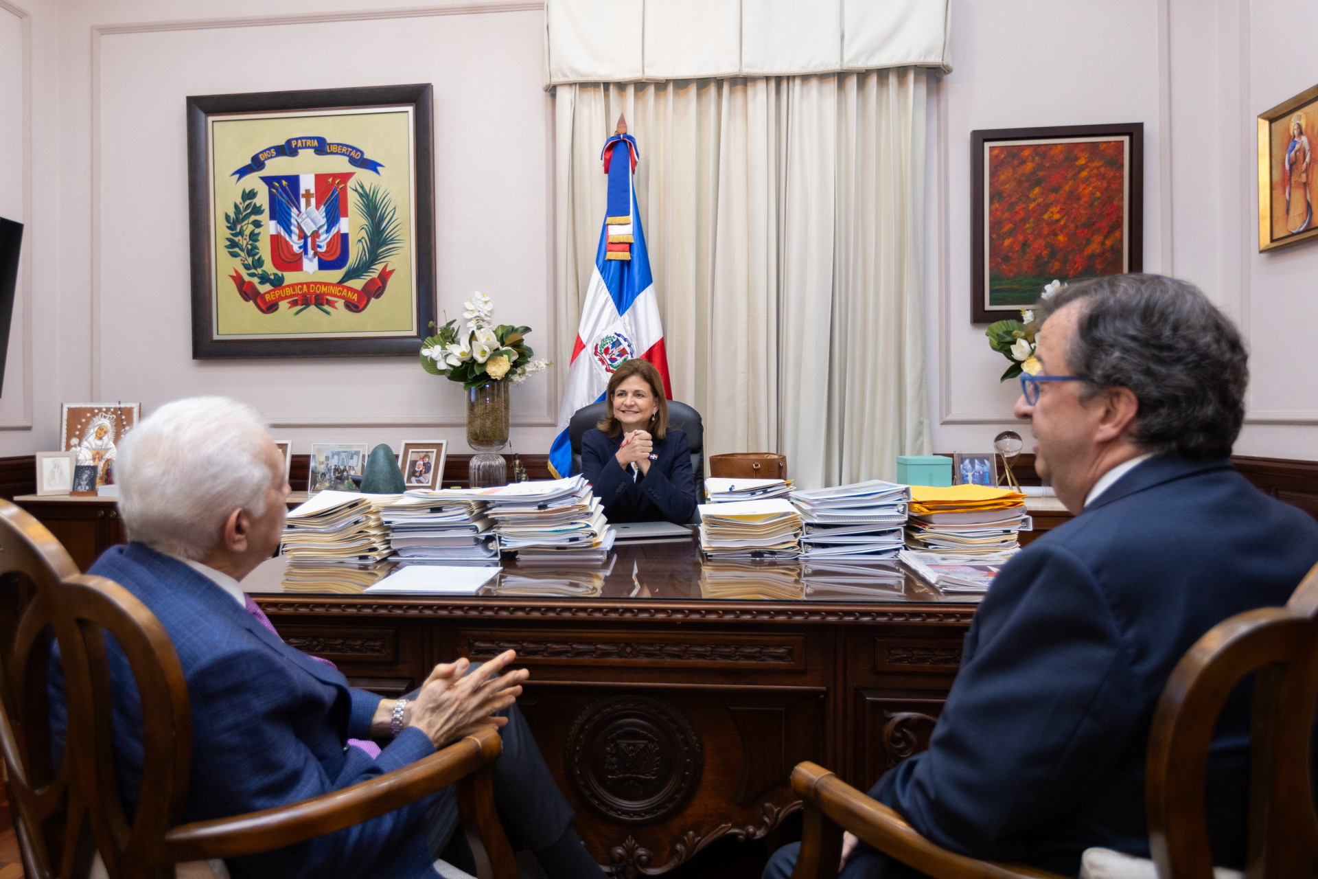 La vicepresidenta Raquel Peña se reunió con el señor Luis Molina Achécar, presidente del Centro Financiero BHD, y el señor Ricardo Fondeur, miembro del Consejo de Administración de esta entidad. Durante la reunión, dialogaron sobre temas vinculados a la estabilidad macroeconómica del país. Santo Domingo, República Dominicana, 12 de Noviembre 2024. Vp/ Amehd Gitte