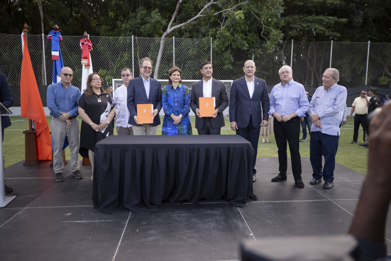 La vicepresidenta Raquel Peña participó en la firma del convenio de comanejo entre la Fundación Cibao Fútbol Club, el Patronato para la Administración del Parque Central de Santiago y la Asociación para el Desarrollo Inc. (APEDI). Este acuerdo busca continuar impulsando el deporte y la recreación en Santiago. Santiago, República Dominicana. 20 de Noviembre del 2024. VP/ Félix Hirujo