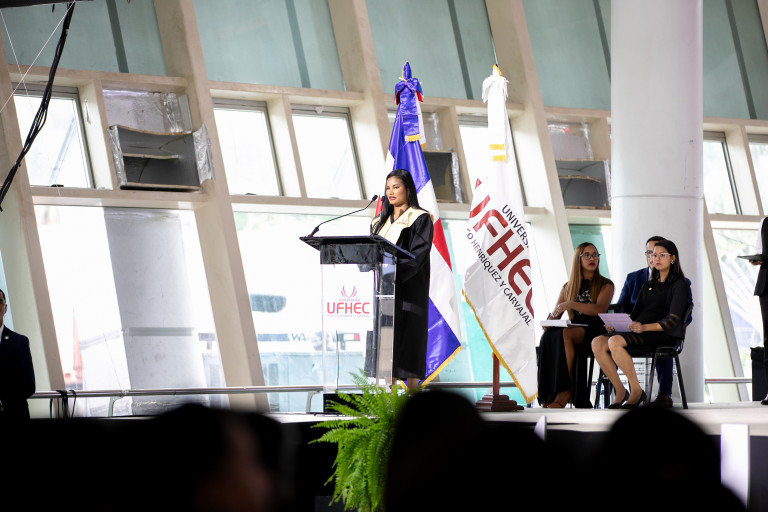 Durante un acto encabezado por la vicepresidenta Raquel Peña, la Universidad UFHEC celebró su cuadragésima segunda investidura, graduando a jóvenes de distintas áreas. A partir de hoy, estos nuevos profesionales aportarán a la sociedad dominicana con sus habilidades y aspiraciones. Santo Domingo, República Dominicana. 28 de Noviembre del 2024. VP/ Sintia Méndez