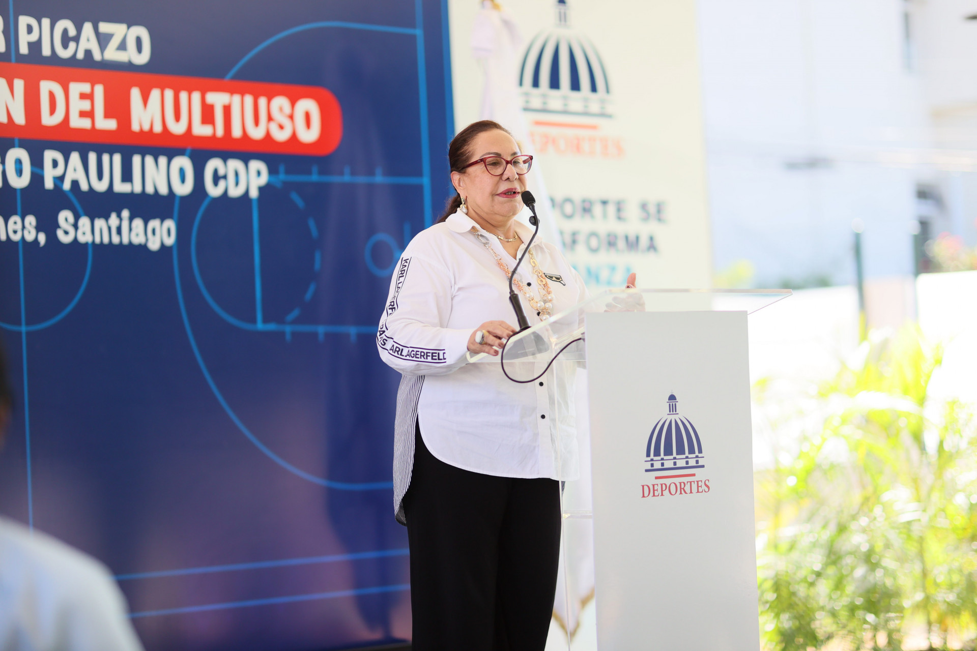 La vicepresidenta Raquel Peña encabezó el primer palazo para los trabajos de construcción del bajo techo del Club Domingo Paulino, un espacio diseñado para que niños, jóvenes y adultos disfruten actividades recreativas y deportivas en un entorno moderno y bien equipado. Santo Domingo, República Dominicana. 15 de Enero del 2024. VP/ Félix Hirujo