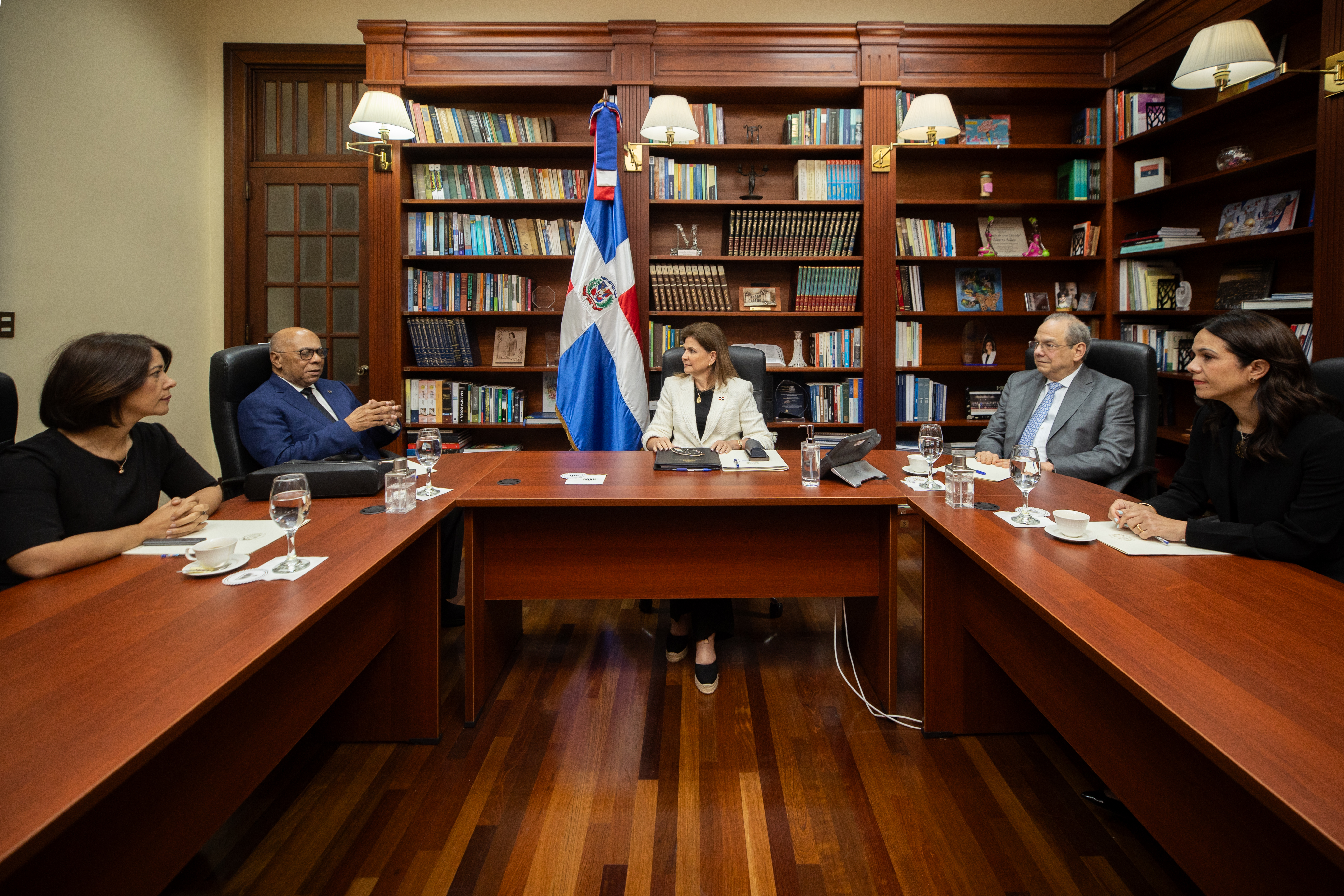 Como parte de su agenda institucional, la vicepresidenta Raquel Peña sostuvo un encuentro con los señores Eduardo M. Trueba, Milton Ray Guevara y otros integrantes de la firma Díaz Trueba Abogados, donde conversaron sobre iniciativas vinculadas a la modernización de los servicios jurídicos, incluyendo la plataforma “Concordium”, orientada a facilitar procesos de conciliación ciudadana. Santo Domingo, República Dominicana. 15 de Abril del 2025. VP/ Félix Hirujo