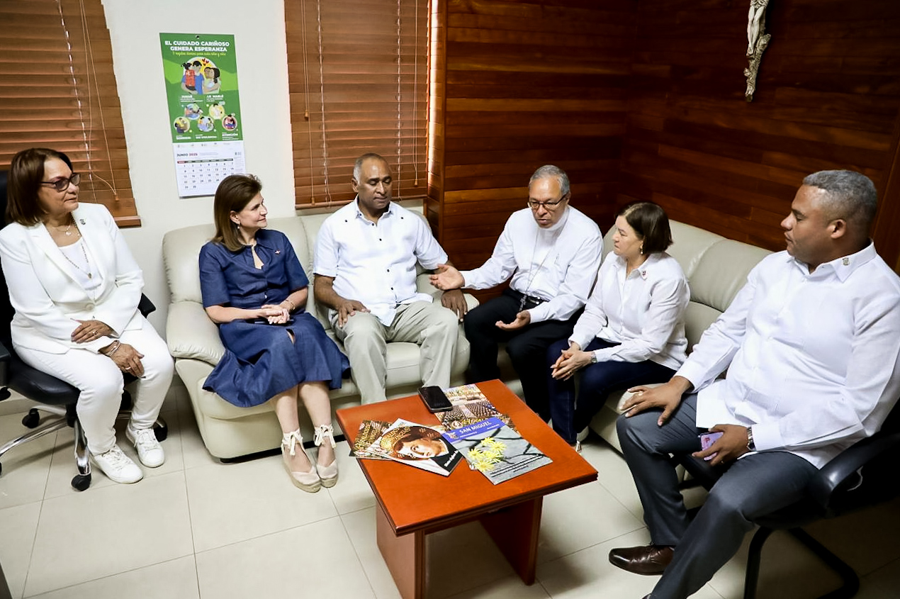 Durante una visita a Peravia, la vicepresidenta Raquel Peña sostuvo un encuentro con el obispo de la diócesis de Baní, monseñor Faustino Burgos Brisman. Peravia, República Dominicana. 20 Junio del 2025. VP/ Fuente externa