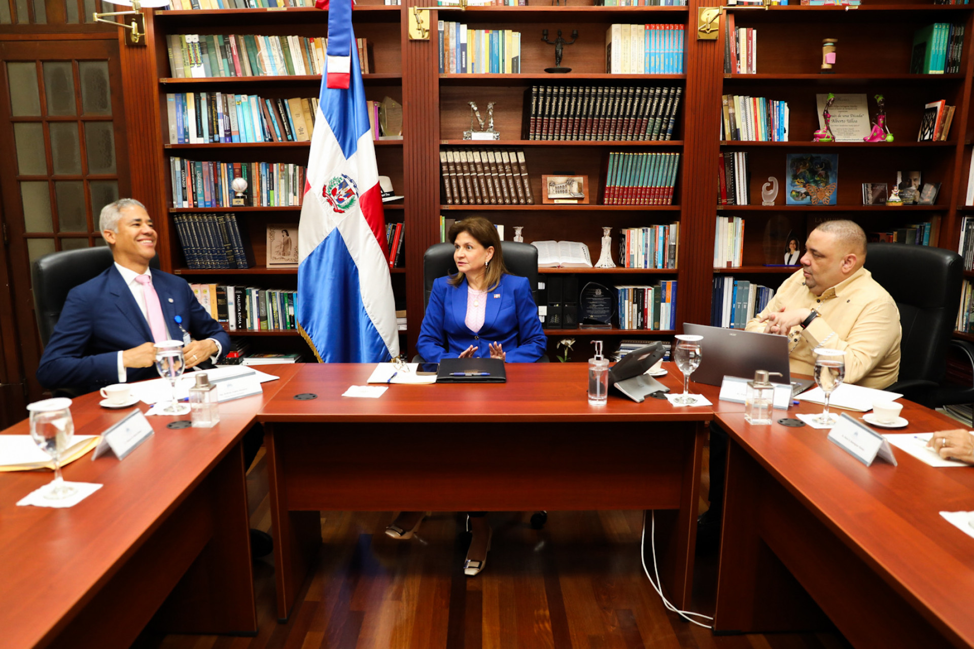 En seguimiento a los proyectos de suministro de agua y saneamiento en Santiago, la vicepresidenta Raquel Peña sostuvo un encuentro con el director general de COORASAN, Andrés Cueto, junto a sus acompañantes, para conversar sobre los avances recientes y las próximas acciones que buscan continuar mejorando la calidad de vida de la población. Santo Domingo, República Dominicana. 30 Julio del 2025. VP/ Sintia Méndez