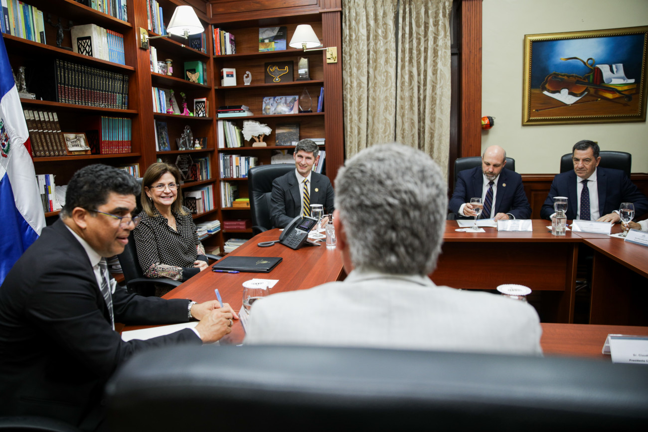 La vicepresidenta Raquel Peña sostuvo una reunión con el alcalde de Santo Domingo Este, Dio Astacio, y representantes de la Comisión Internacional Parlamento & Fe, con quienes conversó sobre iniciativas conjuntas destinadas al fortalecimiento de valores y al desarrollo comunitario en el país. Santo Domingo, República Dominicana. 16 Octubre del 2025. VP/ Erly Morales