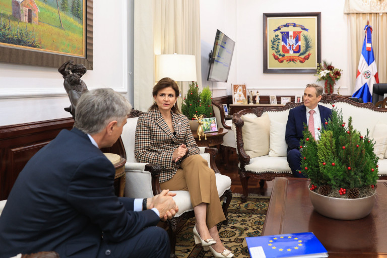 En su primer encuentro luego de presentar sus cartas credenciales, la vicepresidenta Raquel Peña recibió a S. E. Raúl Fuentes Milani, embajador y jefe de la Delegación de la Unión Europea en la República Dominicana, con quien abordó una agenda de trabajo conjunta para seguir fortaleciendo la relación entre la Unión Europea y el país. Santo Domingo, República Dominicana, 1 de Diciembre 2025. Vp/ Amehd Gitte