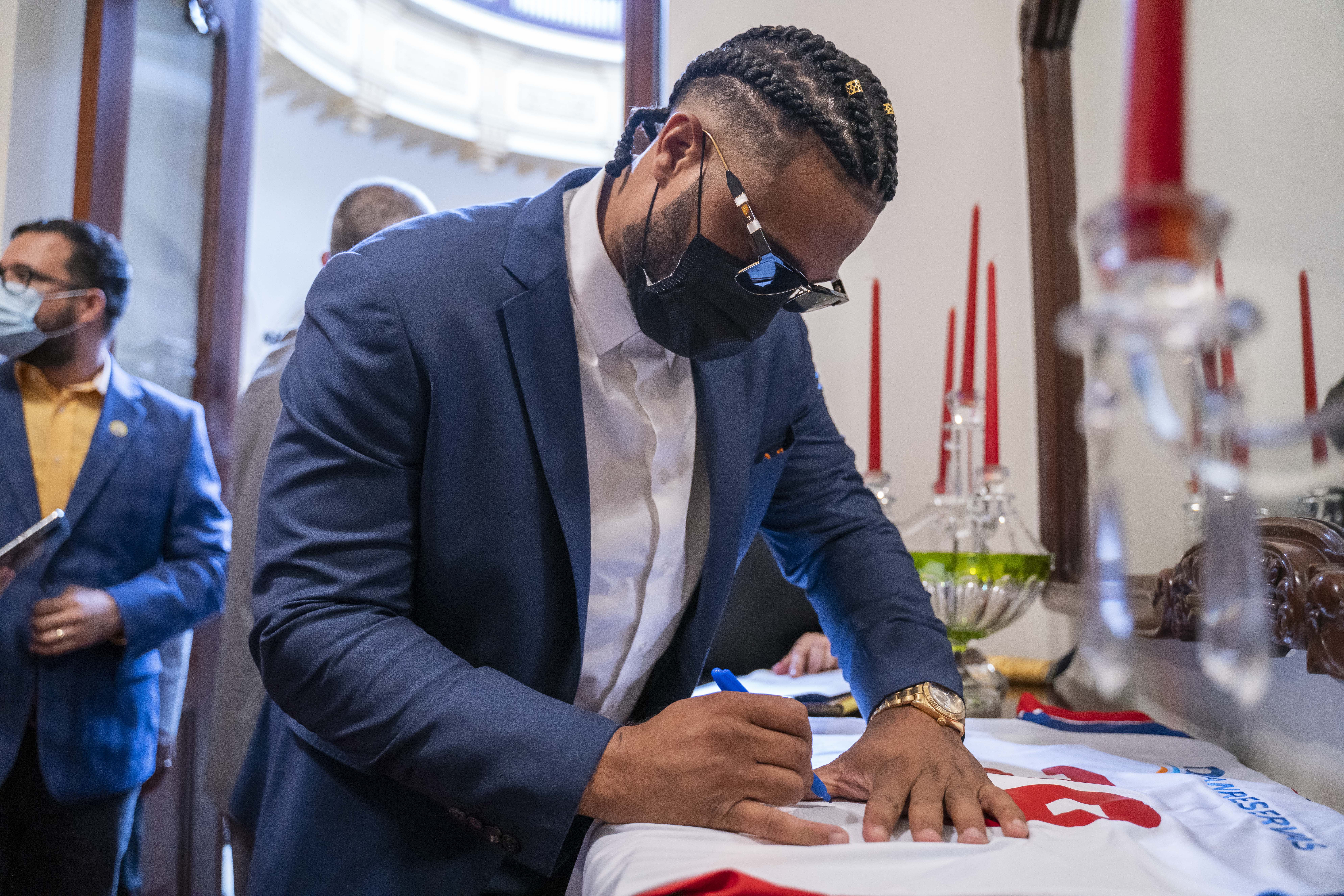 El presidente Luis Abinader y la vicepresidenta Raquel Peña se reúnen con el equipo de las Águilas Cibaeñas para felicitarles por su triunfo en la Serie del Caribe. Santo Domingo, República Dominicana. 9 de Febrero 2021. Vp/ Jhon Escalante