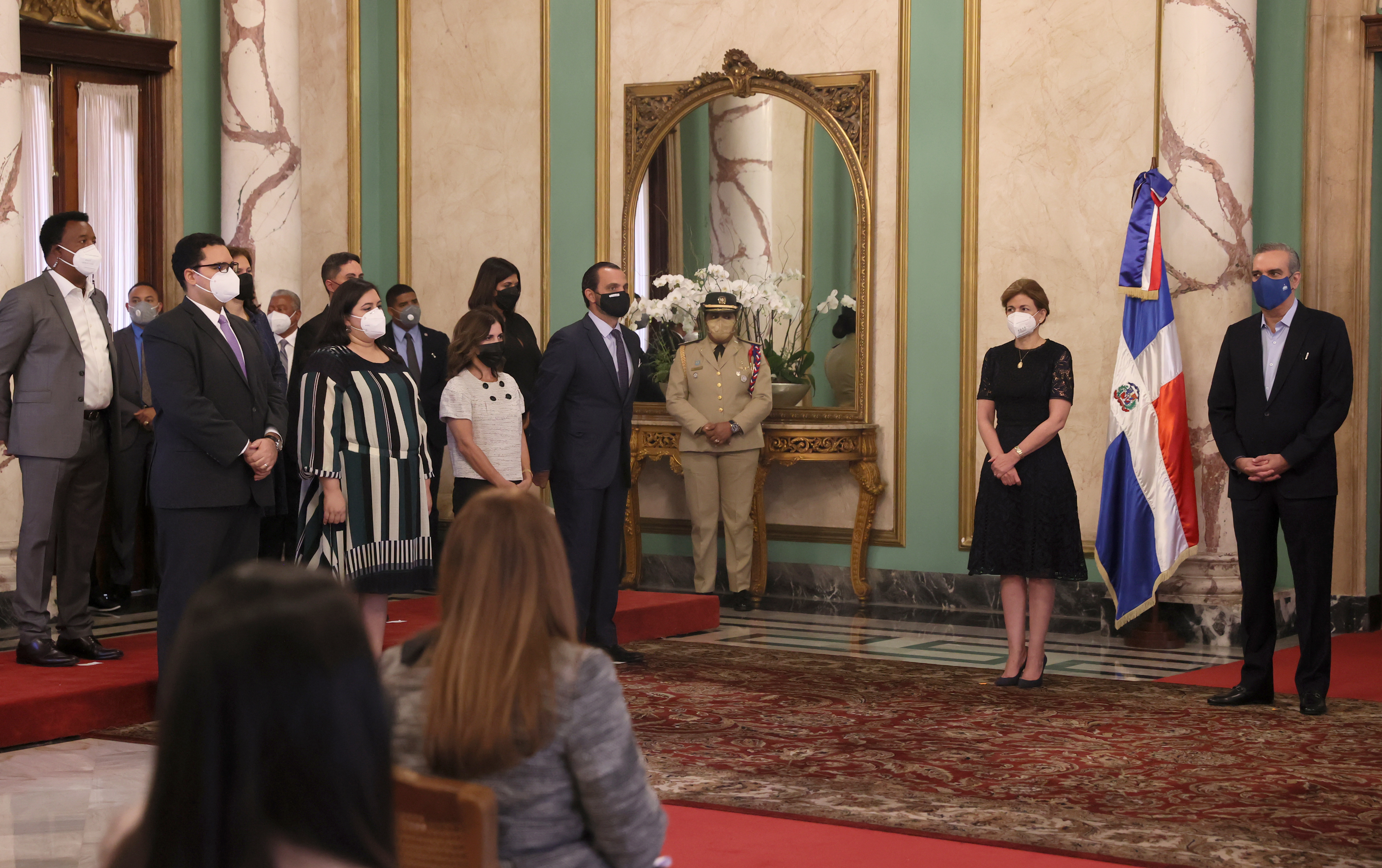 El presidente Luis Abinader, la vicepresidenta Raquel Peña, el ministro de salud Plutarco Arias, y el consultor jurídico del Poder Ejecutivo Antoliano Peralta encabezan el acto de juramentación del Comité gestor de Voluntariados de Instituciones Públicas. Salón Embajadores, Palacio Nacional.