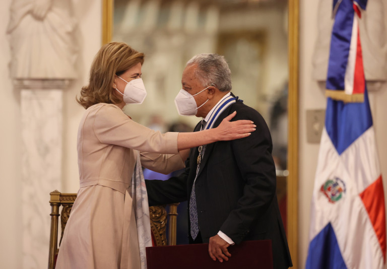 El presidente Luis Abinader, la vicepresidenta Raquel Peña y la primera dama Raquel Arbaje encabezan la ceremonia de imposición de condecoraciones de la Orden del Mérito de Duarte, Sánchez y Mella, en el Grado de Comendador, a los Sres. Rafael Francisco Taveras Rosario, Fidelio Arturo Despradel Roque, Víctor Manuel Báez González, Rafael Antonio Báez Pérez, José Rafael Pérez Modesto y la Sra. Ana Josefina Padilla Deschamps, en presencia de S. E. Hipólito Mejía, Presidente de la Republica 2000 – 2004; Antoliano Peralta, Consultor Jurídico del Poder Ejecutivo; y la Sra. Milagros Ortiz Bosch, Directora de Ética e Integridad Gubernamental. Salón Las Cariátides, Palacio Nacional. Santo Domingo. República Dominicana.11 de Febrero del 2021. VP/Ricardo Rojas