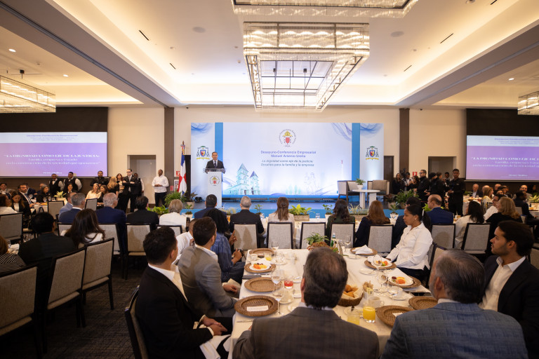 En Santiago, la vicepresidenta Raquel Peña participó en el tradicional Desayuno-Conferencia Empresarial Manuel Arsenio Ureña, organizado por la Fundación Arquidiocesana Santiago Apóstol (FASA), en apoyo a la labor pastoral del arzobispado de esta ciudad. Santiago, República Dominicana. 13 de Marzo del 2026 VP/ Félix Hirujo