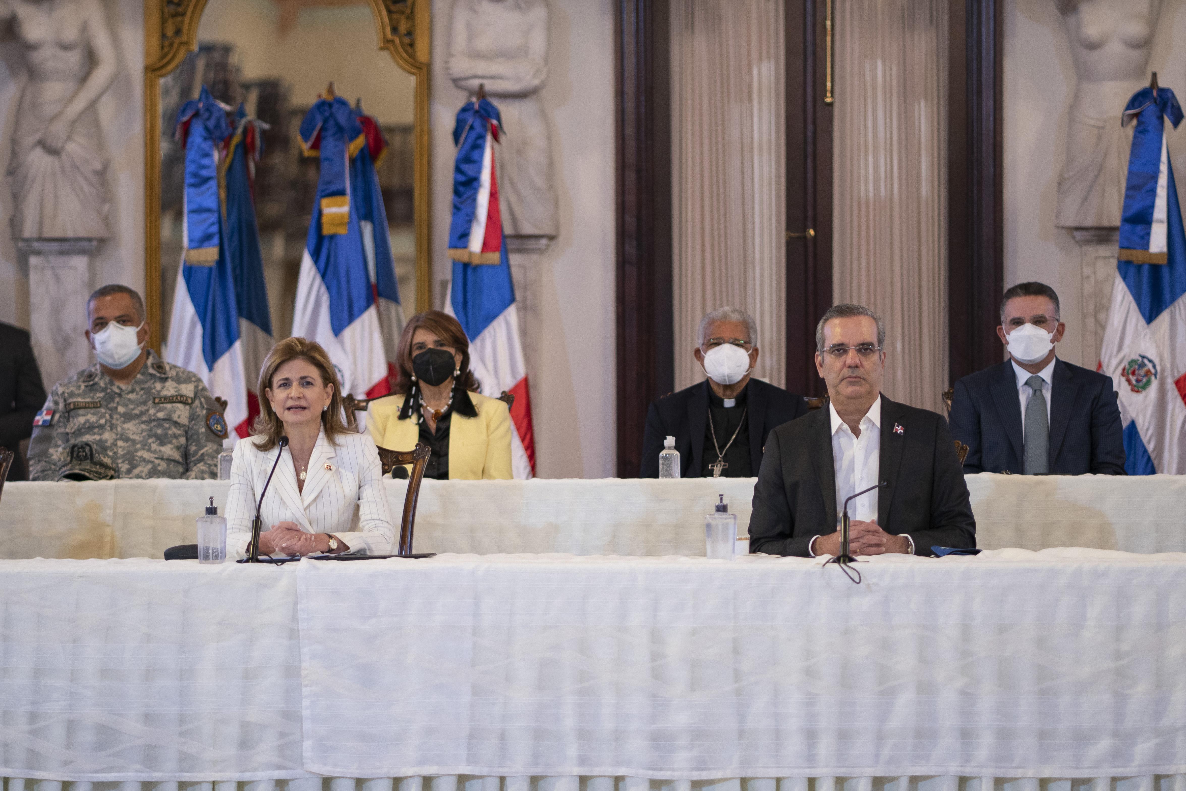 El presidente Luis Abinader y la vicepresidenta Raquel Peña, junto al resto de los miembros del Gabinete de Salud, presentan al país el Plan Nacional de Vacunación contra el COVID-19. Santo Domingo, República Dominicana. 15 de Febrero 2021. Vp/ Jhon Escalante
