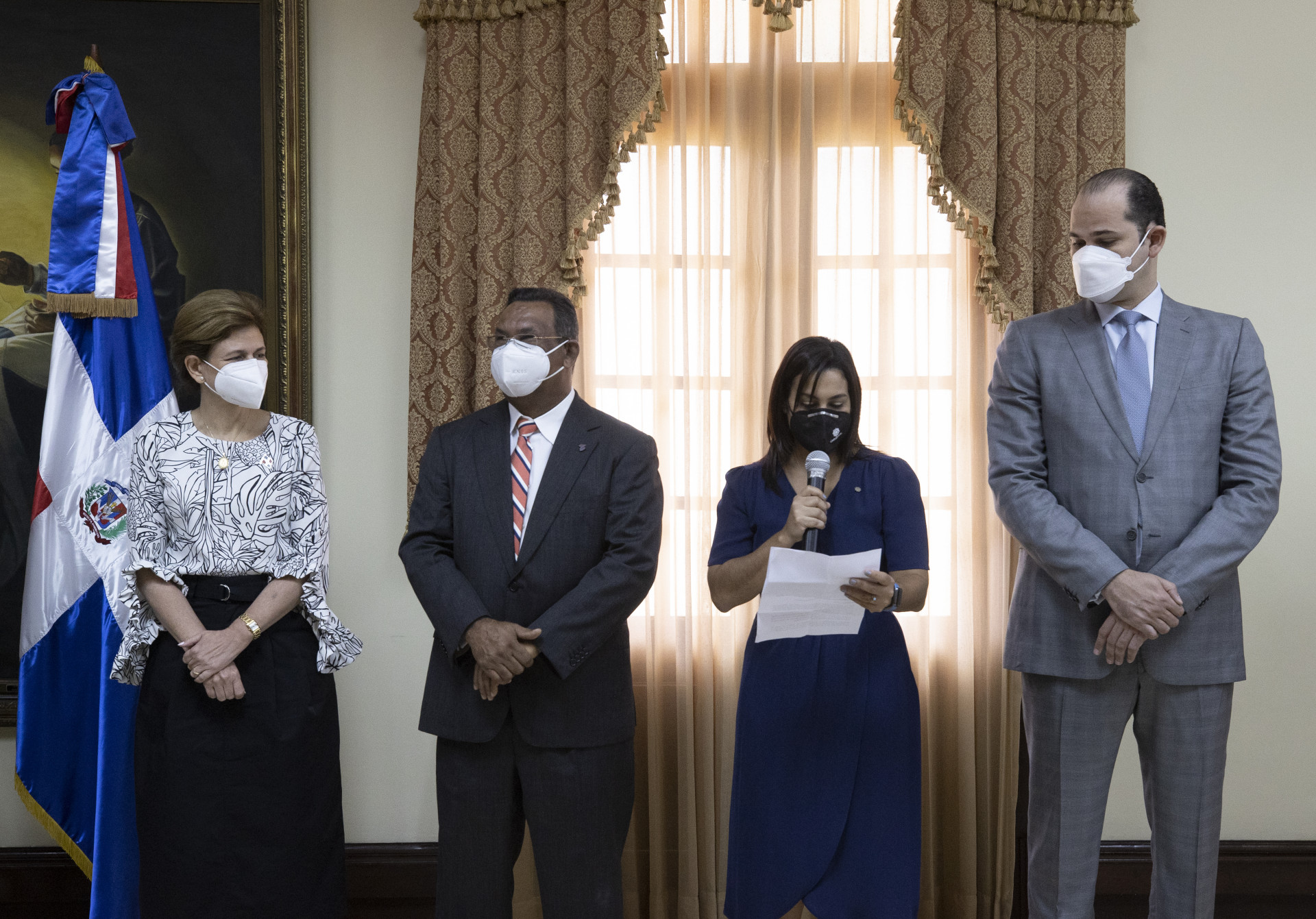 La vicepresidenta Raquel Peña, como coordinadora del Gabinete de Salud, hace el formal recibimiento de la donación de medicamentos por parte de la Alianza Empresarial «Sanar una Nación». Salón Los Trinitarios, Palacio Nacional.