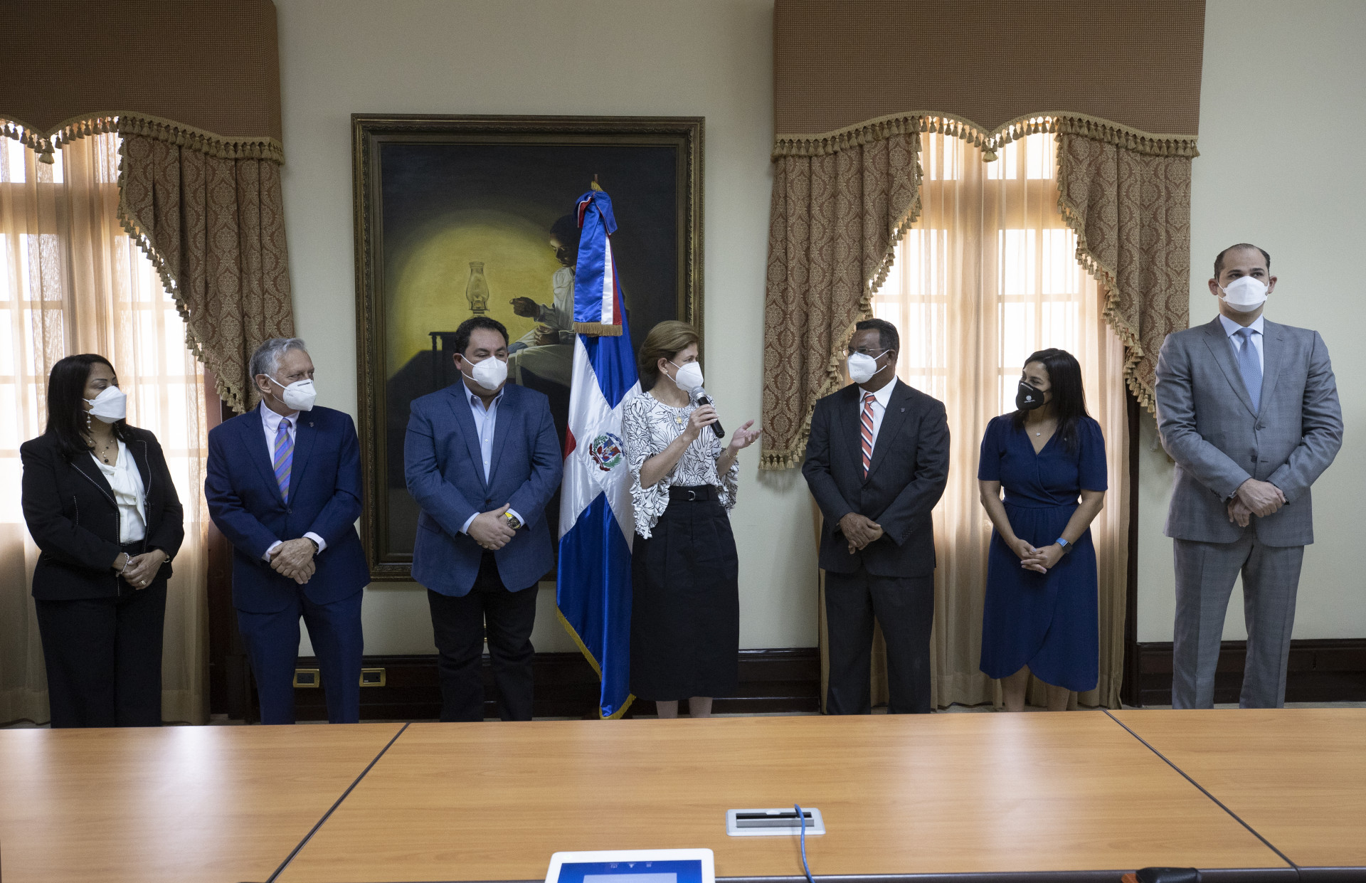 La vicepresidenta Raquel Peña, como coordinadora del Gabinete de Salud, hace el formal recibimiento de la donación de medicamentos por parte de la Alianza Empresarial «Sanar una Nación». Salón Los Trinitarios, Palacio Nacional.
