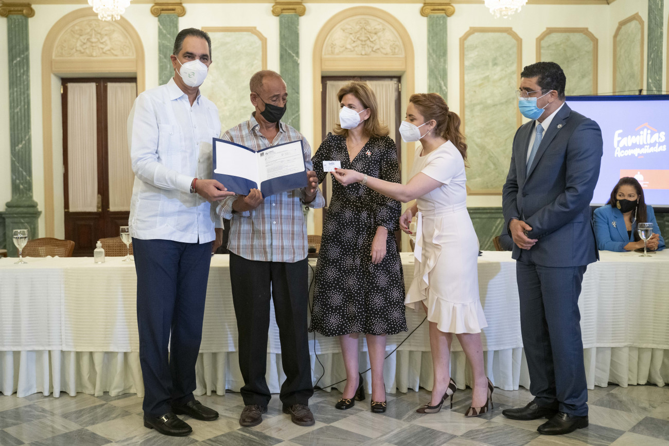 La vicepresidenta Raquel Peña; el coordinador general del Gabinete de la Familia, pastor Dío Astacio; el coordinador del Gabinete de Políticas Sociales, José Francisco (Tony) Peña Guaba; y la directora del programa Progresando con Solidaridad (PROSOLI), Gloria Reyes encabezan el acto de presentación del programa «Familias Acompañadas» con el que se brindará apoyo a familias de personas fallecidas por COVID-19. Santo Domingo, República Dominicana. 10 de Marzo 2021. Vp/ Jhon Escalante