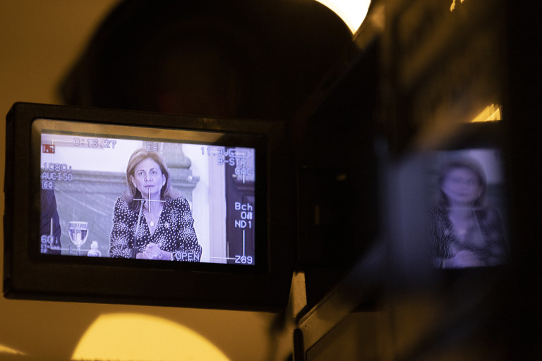 La vicepresidenta Raquel Peña; el coordinador general del Gabinete de la Familia, pastor Dío Astacio; el coordinador del Gabinete de Políticas Sociales, José Francisco (Tony) Peña Guaba; y la directora del programa Progresando con Solidaridad (PROSOLI), Gloria Reyes encabezan el acto de presentación del programa «Familias Acompañadas» con el que se brindará apoyo a familias de personas fallecidas por COVID-19.