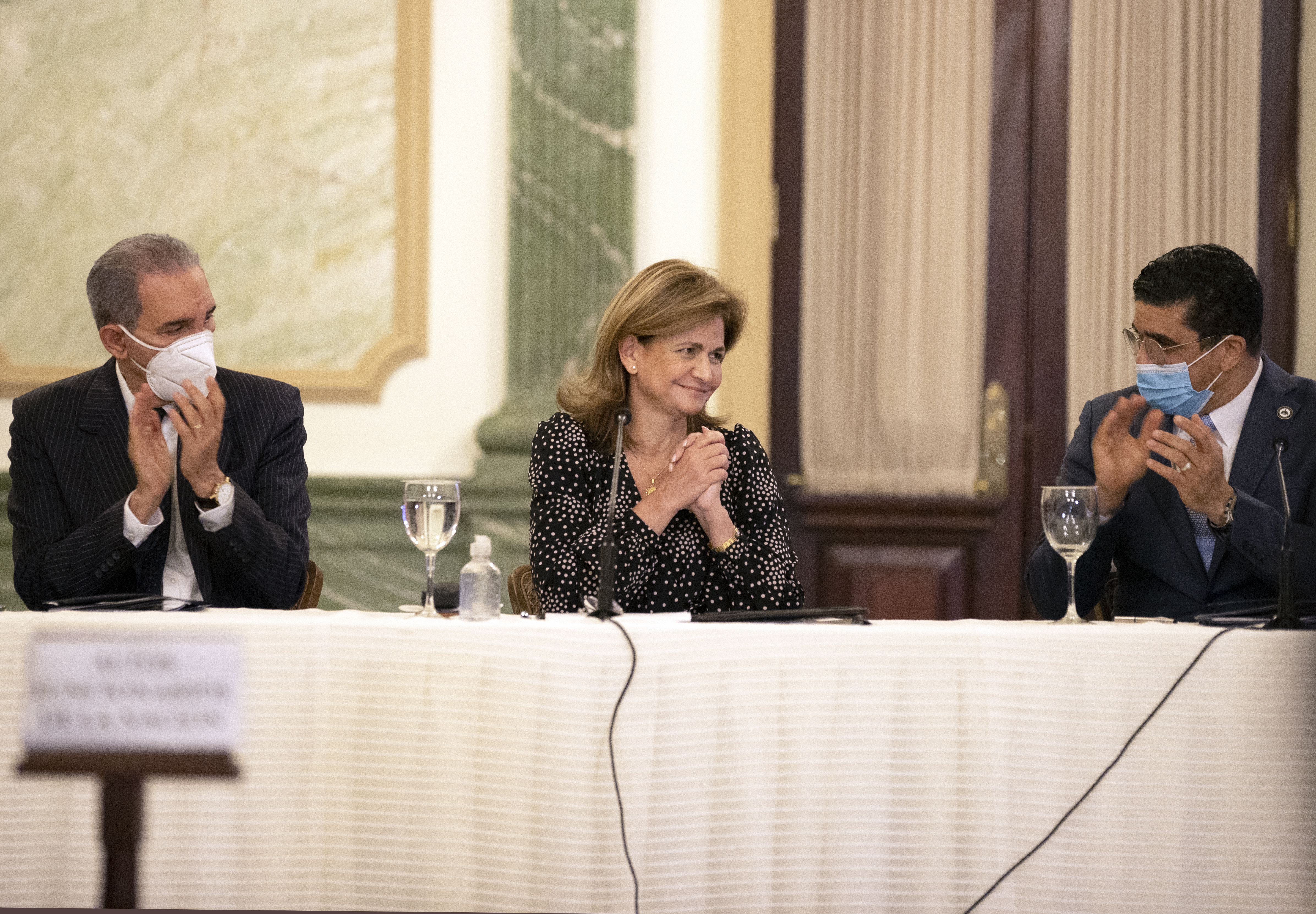 La vicepresidenta Raquel Peña; el coordinador general del Gabinete de la Familia, pastor Dío Astacio; el coordinador del Gabinete de Políticas Sociales,  José Francisco (Tony) Peña Guaba; y la directora del programa Progresando con Solidaridad (PROSOLI), Gloria Reyes encabezan el acto de presentación del programa «Familias Acompañadas» con el que se brindará apoyo a familias de personas fallecidas por COVID-19. Salón Verde, Palacio Nacional.