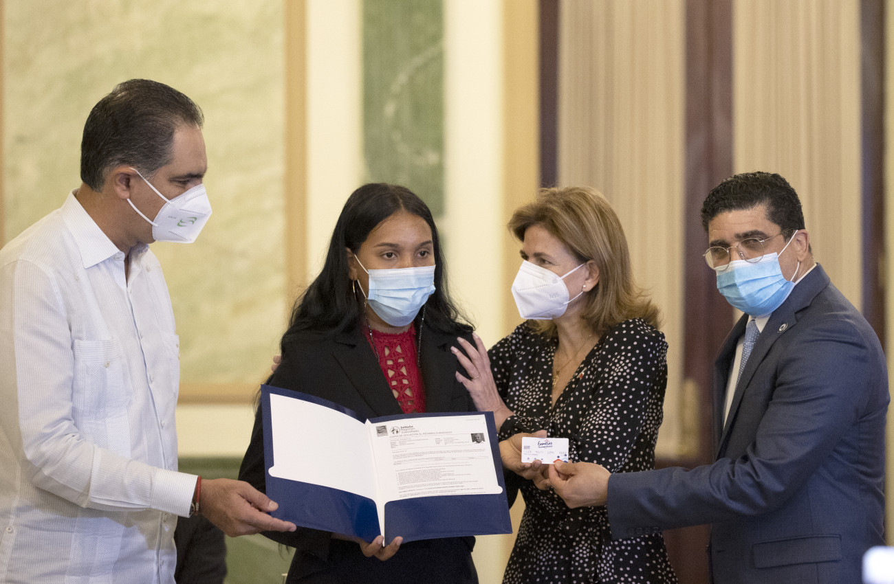 La vicepresidenta Raquel Peña; el coordinador general del Gabinete de la Familia, pastor Dío Astacio; el coordinador del Gabinete de Políticas Sociales, José Francisco (Tony) Peña Guaba; y la directora del programa Progresando con Solidaridad (PROSOLI), Gloria Reyes encabezan el acto de presentación del programa «Familias Acompañadas» con el que se brindará apoyo a familias de personas fallecidas por COVID-19.