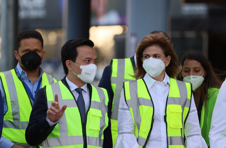 La vicepresidenta Raquel Peña en compañía de Su Excelencia Zhang Run, embajador de la Republica popular China reciben 1,050,000 de dosis de la vacuna contra el COVID-19 a la República Dominicana procedente de China. Aeropuero Internacional Las Americas.