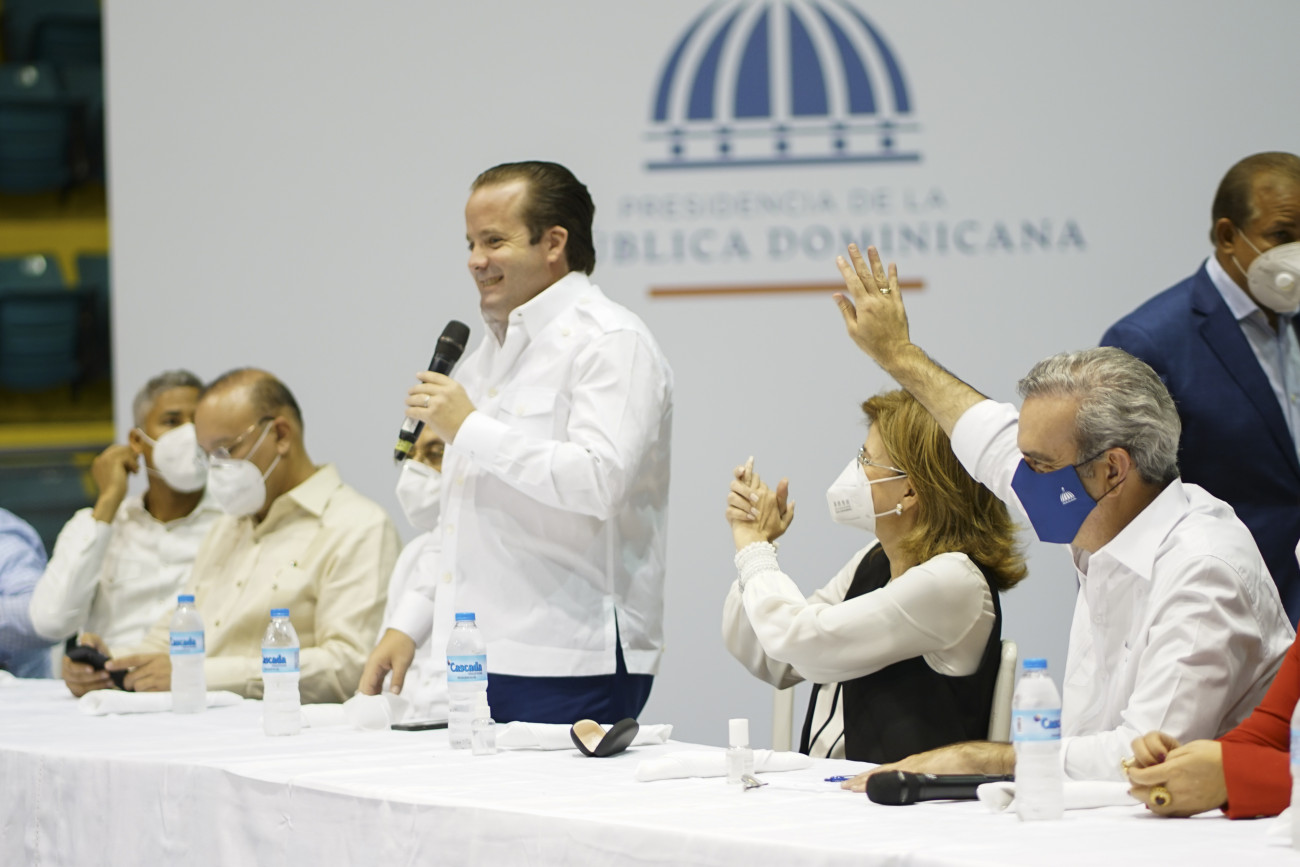 El presidente Luis Abinader y la vicepresidenta Raquel Peña participan en una cena junto a 60 presidentes de «Juntas de Vecinos» en compañía a la gobernadora provincial de Santiago, Rosa Santos; el director del Centro de Desarrollo y Competitividad Industrial (PROINDUSTRIA), el ing. Ulises Rodrٕíguez; el gerente general de la Empresa Distribuidora de Electricidad del Norte (EDENORTE), Ing. Andrés Cueto y el director general de la Corporación del Acueducto y Alcantarillado de Santiago (CORAASAN), Ing. Andrés Burgos, en el Multiuso del sector Los Jazmines. Santiago de los Caballeros, República Dominicana. 18 de Noviembre de 2020. Vp/ Jhon Escalante