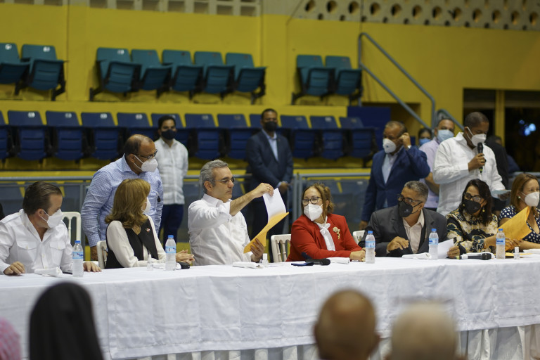 El presidente Luis Abinader y la vicepresidenta Raquel Peña participan en una cena junto a 60 presidentes de «Juntas de Vecinos» en compañía a la gobernadora provincial de Santiago, Rosa Santos; el director del Centro de Desarrollo y Competitividad Industrial (PROINDUSTRIA), el ing. Ulises Rodrٕíguez; el gerente general de la Empresa Distribuidora de Electricidad del Norte (EDENORTE), Ing. Andrés Cueto y el director general de la Corporación del Acueducto y Alcantarillado de Santiago (CORAASAN), Ing. Andrés Burgos, en el Multiuso del sector Los Jazmines. Santiago de los Caballeros, República Dominicana. 18 de Noviembre de 2020. Vp/ Jhon Escalante