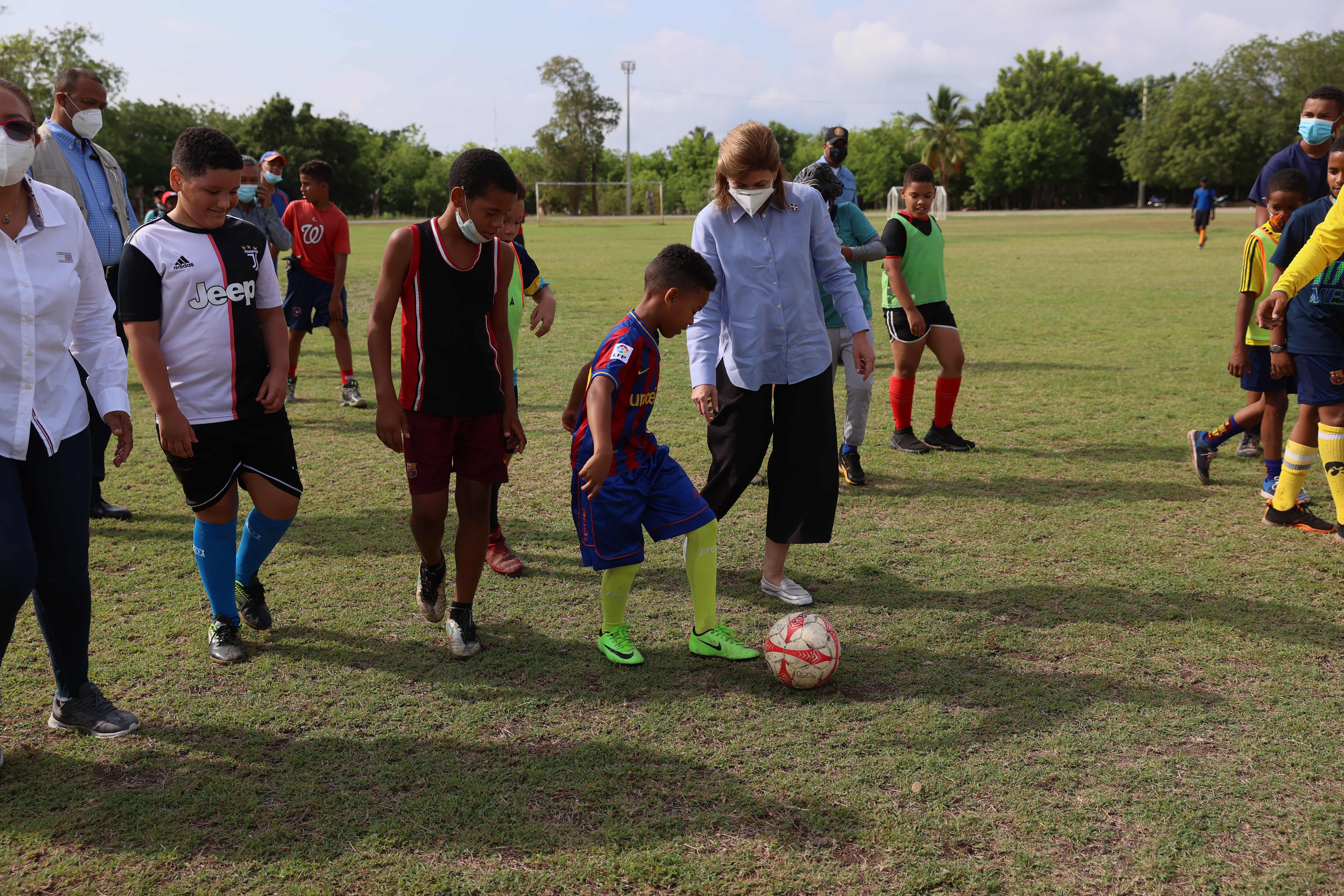 La vicepresidenta Raquel Pena visita las instalaciones del Complejo Deportivo «José Altagracia Puello Rodríguez» para compartir con autoridades locales y un grupo de jóvenes deportistas.