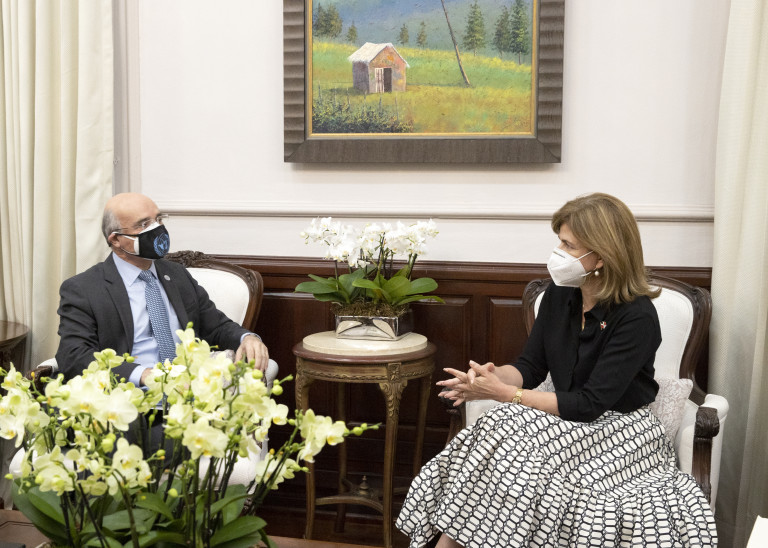La vicepresidenta Raquel Peña sostiene una reunión con Su Excelencia Mauricio Ramirez Villegas, Coordinador Residente (CR) del Sistema de Desarrollo de las Naciones Unidas (UNDS), y el Sr. Carlos Pimentel, director de la Dirección General de Contrataciones Públicas.