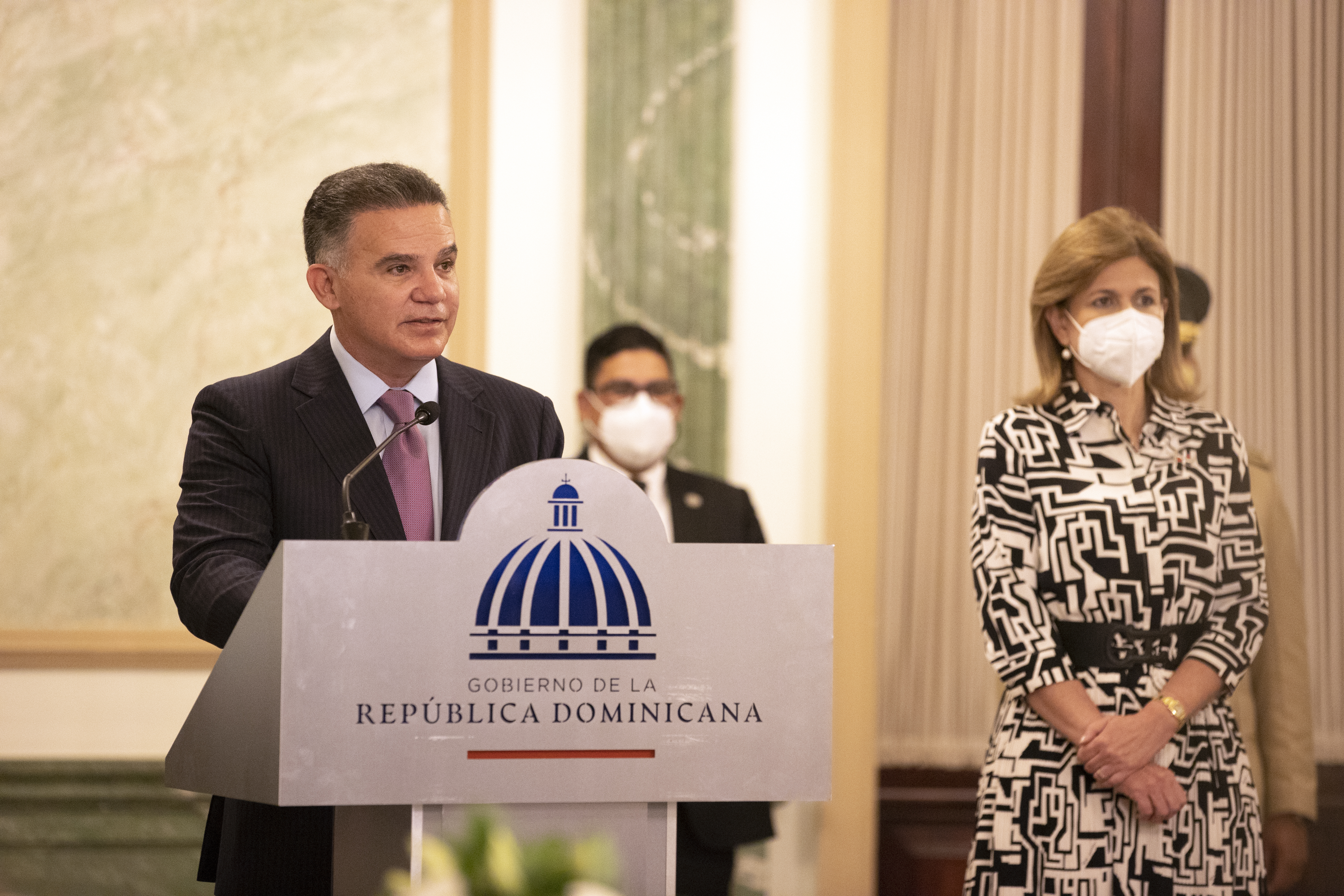 El presidente Luis Abinader y la vicepresidenta Raquel Peña encabezan un encuentro con representantes del sector privado, grandes aliados del Plan #VacúnateRD. Salón Verde, Palacio Nacional.