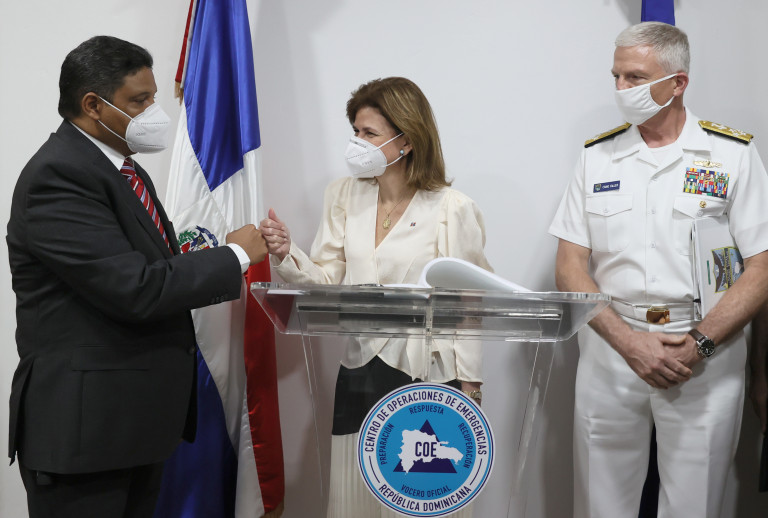 La vicepresidenta Raquel Peña encabeza la entrega de donación por parte de los Estados Unidos de América, representado por Su Señoria Robert W. Thomas, encargado de negocios de la Embajada de Estados Unidos en Santo Domingo; y el Almirante Craig S. Faller, comandante del comando sur de los Estados Unidos de América al gobierno de la Republica Dominicana.  Centro de Operaciones de Emergencias (COE), Santo Domingo.