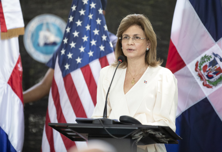 La vicepresidenta Raquel Peña encabeza la entrega de donación por parte de los Estados Unidos de América, representado por Su Señoria Robert W. Thomas, encargado de negocios de la Embajada de Estados Unidos en Santo Domingo; y el Almirante Craig S. Faller, comandante del comando sur de los Estados Unidos de América al gobierno de la Republica Dominicana.  Centro de Operaciones de Emergencias (COE), Santo Domingo.