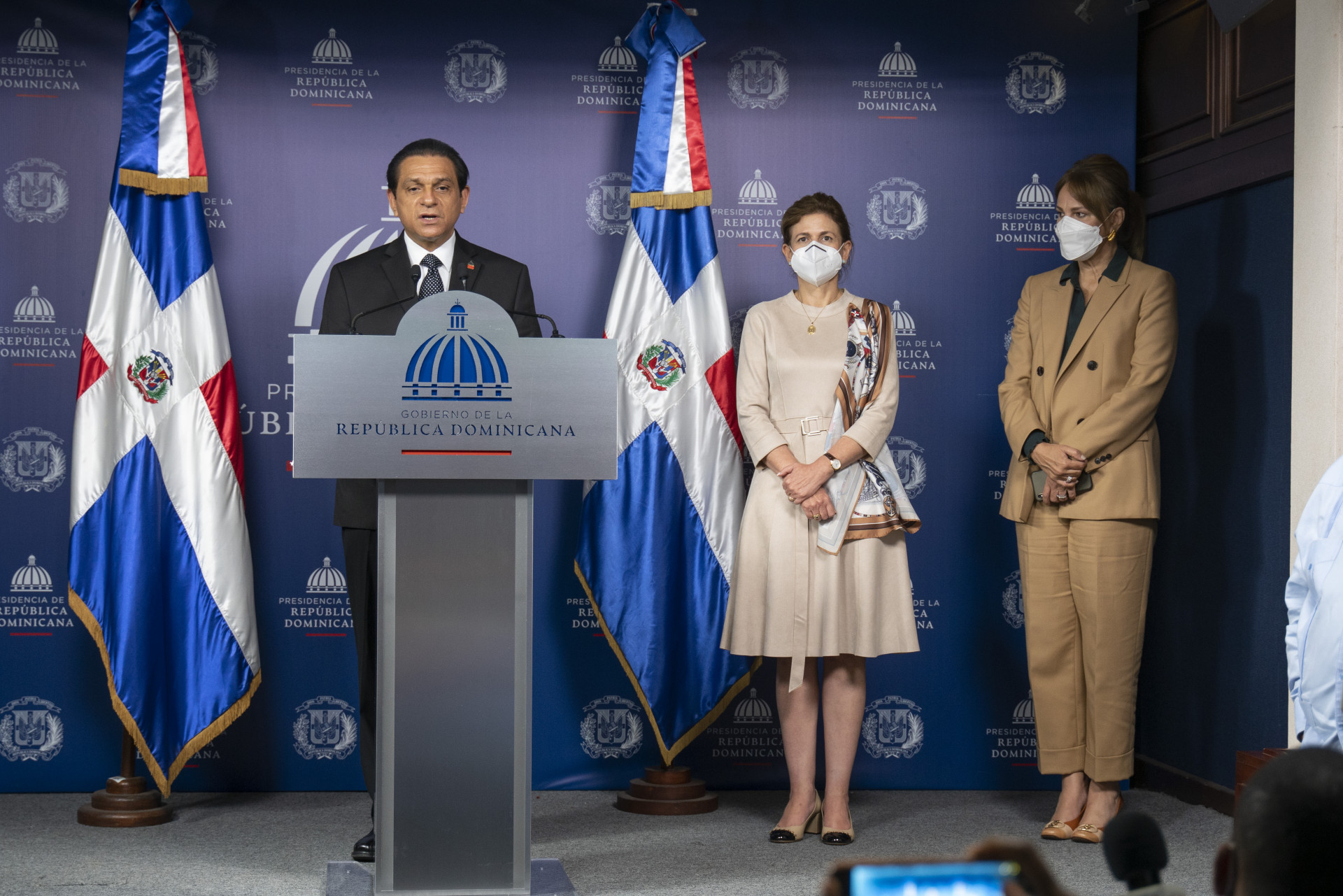 La vicepresidenta Raquel Peña, el Dr. Daniel Rivera, ministro de Salud Pública y Asistencia Social, y la Sra. Milagros German, directora de Comunicaciones y vocera de la Presidencia de la República Dominicana; encabezan rueda de prensa a puertas abiertas con novedades sobre el Plan #VacúnateRD. Santo Domingo, Republica Dominicana. 22 de Abril 2021. Vp/ Jhon Escalante
