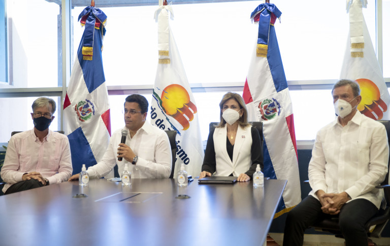 La vicepresidenta Raquel Peña, el ministro de relaciones exteriores, canciller Roberto Álvarez; el ministro de turismo, David Collado y Su Excelencia Dr. Volker Pellet, embajador de Alemania en República Dominicana; encabezan una rueda de prensa para anunciar que las autoridades de la República Federal de Alemania, a partir del 25 de abril, no considerará a la Republica Dominicana como un «área de riesgo» de infección de COVID-19, y para anunciar importantes noticias vinculadas al sector salud y turismo.