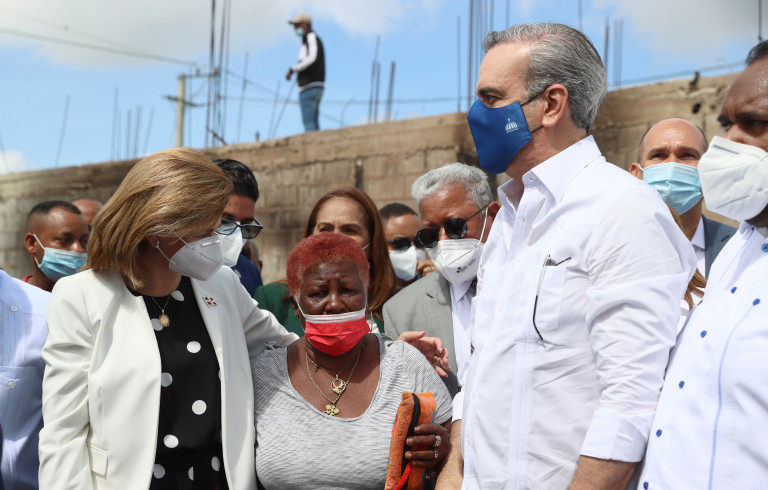 El presidente Luis Abinader y la vicepresidenta Raquel Peña encabezan la supervisión de los trabajos de construcción y reparación que realiza el Instituto Nacional de la Vivienda (INVI) en un área de viviendas siniestradas.