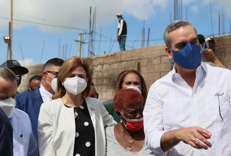 El presidente Luis Abinader y la vicepresidenta Raquel Peña encabezan la supervisión de los trabajos de construcción y reparación que realiza el Instituto Nacional de la Vivienda (INVI) en un área de viviendas siniestradas.