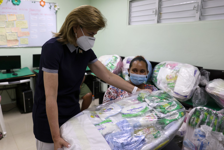 La vicepresidenta Raquel Peña sostiene un encuentro con jóvenes y mujeres de diferentes comunidades que asisten a las acciones formativas que se están desarrollando a través Progresando con Solidaridad (ProSoli) en el Centro de Capacitación y Producción Progresando (CCPP) de Baní, y aprovecha la oportunidad para hacer entrega de canastillas a mujeres embarazadas como parte del proyecto de prevención de salud.