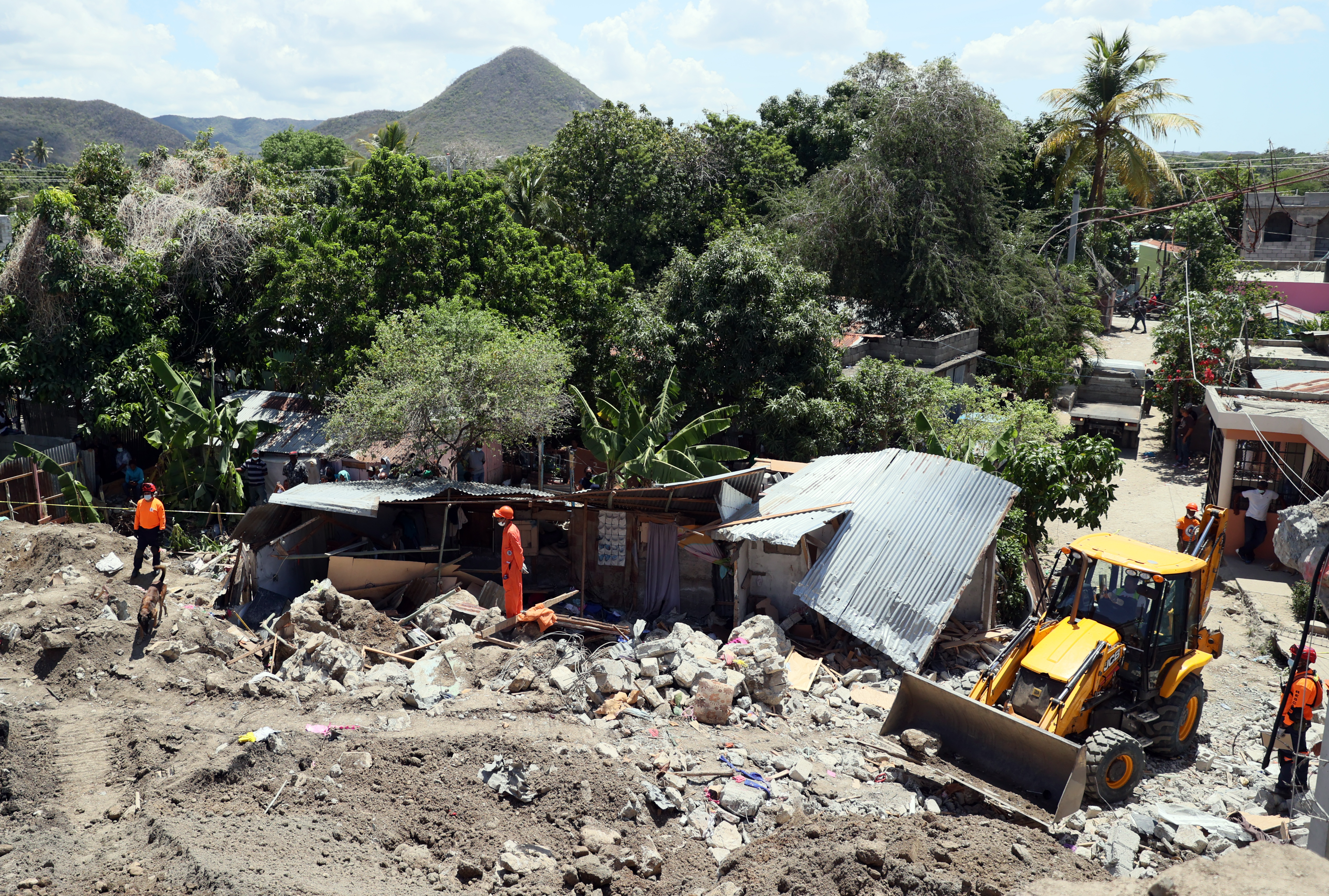La vicepresidenta Raquel Peña acompaña a miembros del Departamento de Operaciones de la Defensa Civil Dominicana tras el derrumbe la pared de una ferretería sobre una vivienda del barrio Villa Carmen en el sector Villa Manega.