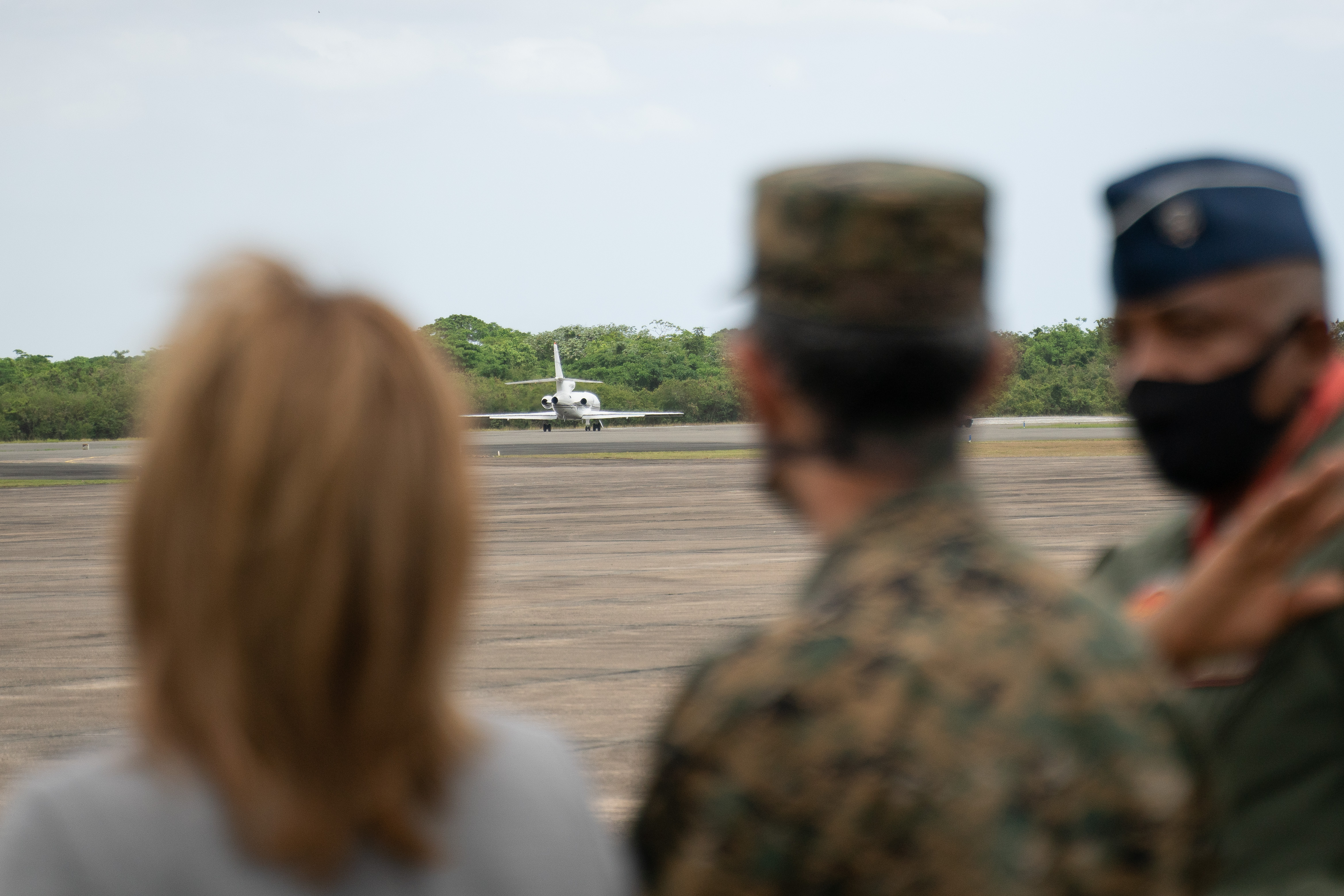 La Excelentísima Sra. Raquel Peña, vicepresidenta de la República Dominicana, le da la despedida al al Excelentísimo Sr. Luis Abinader, Presidente de la República Dominicana, quién asiste al acto de toma de posesión del presidente electo de la República del Ecuador, Guillermo Lasso; en compañía del canciller Roberto Álvarez; Eilyn Beltrán, secretario del Gabinete del Presidente y Mercedes Pichardo, asistente personal del mandatario. Santo Domingo, República Dominicana. 23 de Mayo 2021. Vp/ Jhon Escalante
