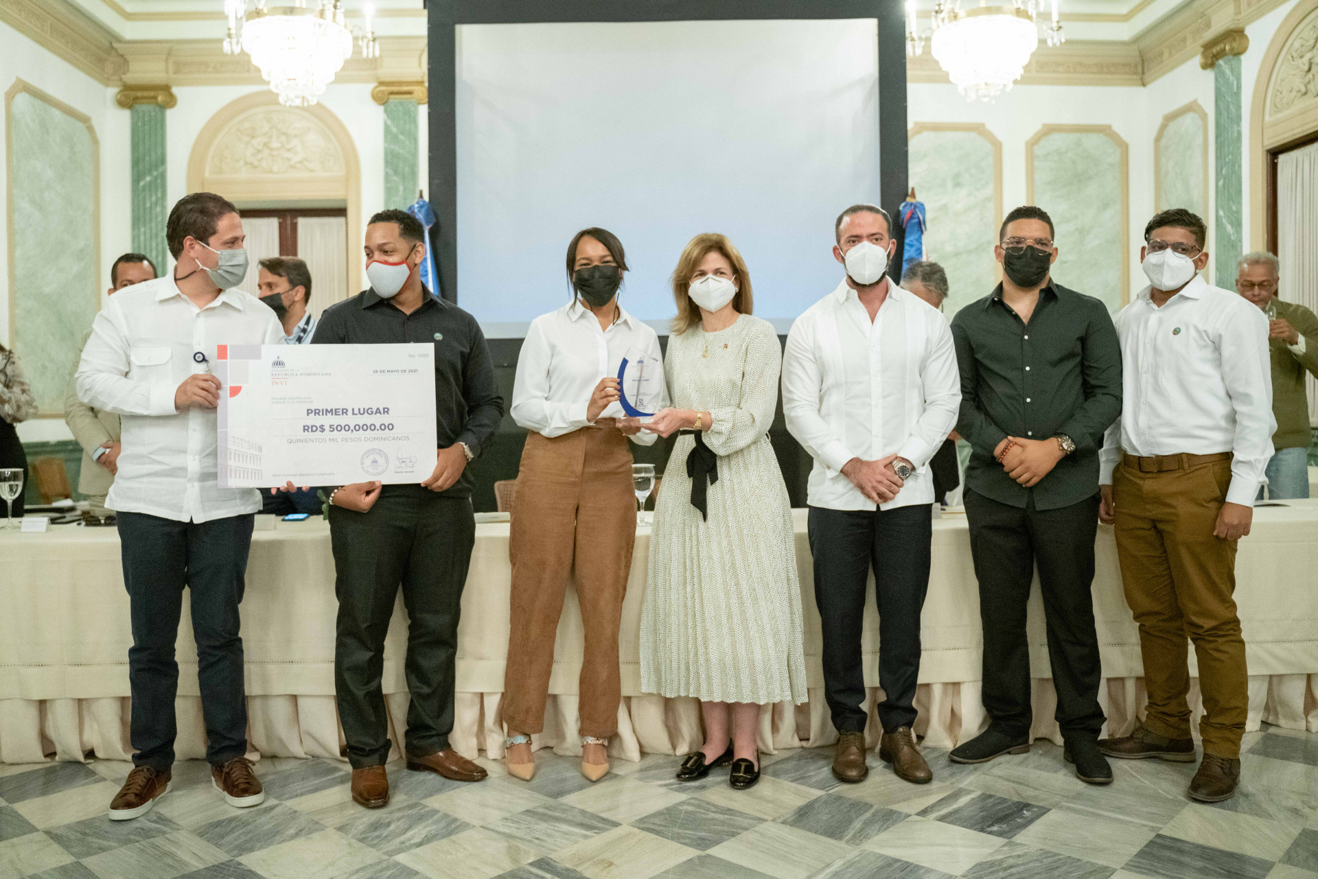 La vicepresidenta Raquel Peña, el Sr. Carlos Bonilla, Director General del Instituto Nacional de la Vivienda (INVI), y el Sr. Francesco Gravina, Presidente de la Unión de Escuelas y Facultades de Arquitectura de la República Dominicana (EFA-RD), entregan premios a los ganadores del concurso a las facultades de arquitectura para el diseño de la nueva fachada del INVI. Santo Domingo, República Dominicana. 26 de Mayo 2021. Vp/ Jhon Escalante