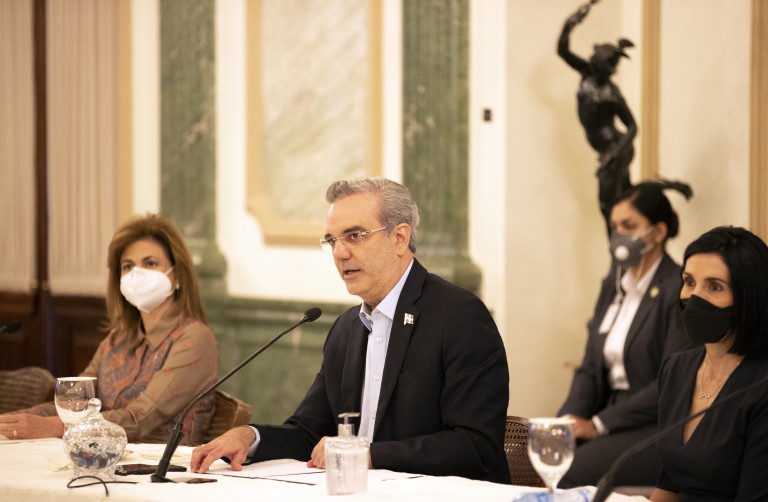 El presidente Luis Abinader y la vicepresidenta Raquel Peña,  encabezan un conversatorio con los rescatistas que salvaron la vida de todos los vacacionistas que quedaron atrapados por una avería el pasado 23 de mayo del 2021 en la cabina del Teleférico de Puerto Plata. Salón Verde, Palacio Nacional.