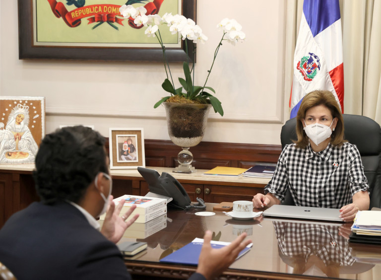 La vicepresidenta Raquel Peña sostiene una reunion con el Ing. Nelson Camilo, Coordinador General Unidad Ejecutora para la Readecuación de Barrios y Entornos (URBE). Despacho de la vicepresidencia, Palacio Nacional.