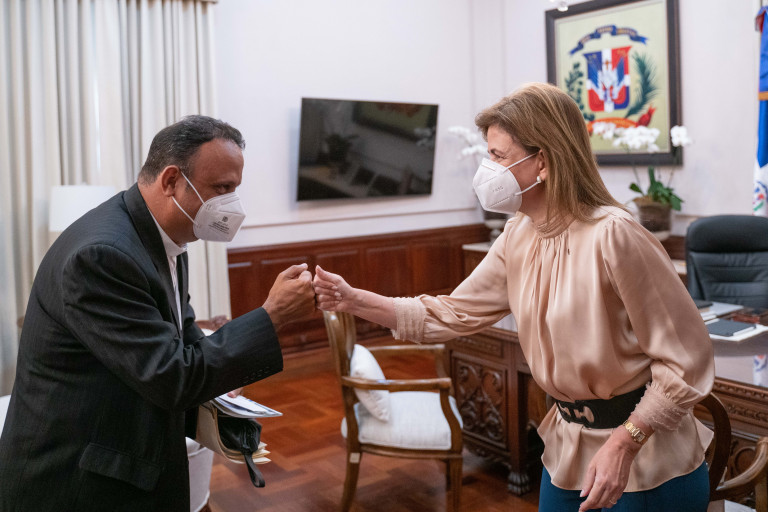 La vicepresidenta Raquel Peña sostiene una reunión con el Padre Eduardo Núñez Collado, presidente de La Fundación Solidaria del Divino Niño Jesús, Inc. Santo Domingo, República Dominicana. 21 de Junio 2021. Vp/ Jhon Escalante