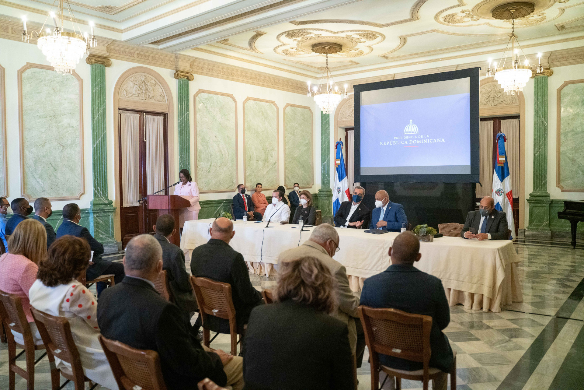 El presidente Luis Abinader, la vicepresidenta Raquel Peña, en compañía de los Sres. Roberto Furcal y Xiomara Guante, ministro de Educación y directora de la Asociación Dominicana de Profesores, encabezan el acto de firma de acuerdo entre el Ministerio de Educación y la Asociación de Dominicana de Profesores. Santo Domingo, República Dominicana. 30 de Junio 2021. Vp/ Jhon Escalante